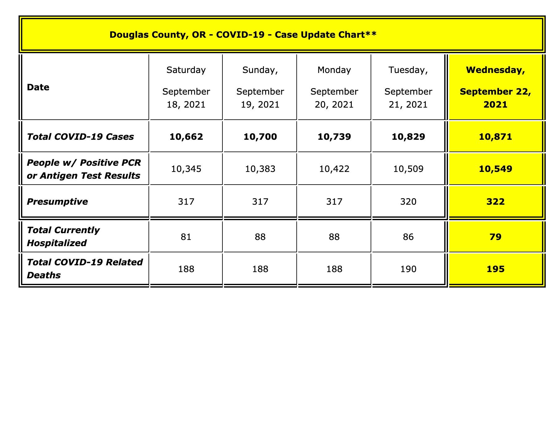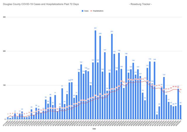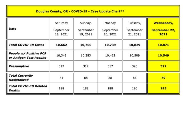 As of 12:00 pm today, Wednesday, September 22, 2021, there are FORTY (40) people with new positive test results, TWO (2) new presumptives and FIVE (5) new deaths to report bringing the total number of cases of people with positive test results and presumptives in Douglas County to 10,871*. Currently, there are SEVENTY-NINE (79) Douglas County COVID-19 patients that are being hospitalized, fifty-seven locally and twenty-two out-of-the-area, including one that has been transferred out of the state for specialized care not available here. We continue to work with Mercy to provide information on our COVID patients being hospitalized locally: 17 ventilators (invasive mechanical airway support) and 8 BiPAP’s (Non-invasive ventilation for breathing support) machines are currently in use, 12 COVID positive patients are in the Intensive Care Unit (ICU) and 14 are in the Progressive Care Unit (PCU). 47% of the total hospitalized patients at Mercy are COVID positive. Of our hospitalized cases today, SEVENTY-THREE (73) patients out of the 79 patients are not fully vaccinated. COVID-19 RECAP FOR TUESDAY, SEPTEMBER 21, 2021 On Tuesday, September 21, 2021, at 12:00 pm we had EIGHTY-SEVEN (87) people with new positive test results, THREE (3) new presumptive and TWO (2) new COVID-19 related deaths to report bringing our total number of cases of people with positive test results and presumptives in Douglas County to 10,829*. We had EIGHTY-SIX (86)Douglas County COVID-19 patients hospitalized, sixty-four locally and twenty-two out-of-the-area, including one patient that has been transferred out of the state for specialized care not available here. We continue to work with Mercy to provide information on our COVID patients being hospitalized locally: 20 ventilators (invasive mechanical airway support) and 8 BiPAP’s (Non-invasive ventilation for breathing support) machines are currently in use, 14 COVID positive patients are in the Intensive Care Unit (ICU) and 16 are in the Progressive Care Unit (PCU). 45% of the total hospitalized patients at Mercy are COVID positive. Of our hospitalized cases on Tuesday, SEVENTY-EIGHT (78) patients out of the 84 patients are not fully vaccinated. COVID-19 RELATED DEATHS OF DOUGLAS COUNTY RESIDENTS Douglas County Public Health has confirmed the deaths of seven more Douglas County residents related to the COVID-19 virus. Our one hundred and eighty-nine COVID-19 related death was a 70-year-old man who was diagnosed with COVID-19 on Thursday, August 19, 2021 and passed away on Tuesday, September 21, 2021. He was not vaccinated. Our one hundred and ninetieth COVID-19 related death was a 50-year-old man who passed away on Monday, September 13, 2021, and tested positive for COVID-19 post-mortem on Saturday, September 18, 2021. He was not vaccinated. Our one hundred and ninety-first COVID-19 related death was a 64-year-old man who was diagnosed with COVID-19 on Wednesday, September 15, 2021 and passed away on Thursday, September 16, 2021. He was not vaccinated. Our one hundred and ninety-second COVID-19 related death was an 84-year-old man who was diagnosed with COVID-19 on Sunday, September 5, 2021 and passed away on Wednesday, September 15, 2021. He was not vaccinated. Our one hundred and ninety-third COVID-19 related death was a 56-year-old man who was diagnosed with COVID-19 on Tuesday, August 24, 2021 and passed away on Wednesday, September 15, 2021. He was partially vaccinated. Our one hundred and ninety-fourth COVID-19 related death was a 54-year-old man who was made a presumptive case on Thursday, September 16, 2021 and passed away on Friday, September 17, 2021. He was not vaccinated. Our one hundred and ninety-fifth COVID-19 related death was a 66-year-old woman who was diagnosed with COVID-19 on Monday, September 6, 2021 and passed away on Wednesday, September 15, 2021. She was not vaccinated. In the interest of privacy for the loved ones of this resident, and as our ethical responsibility to follow all medical laws, no additional information will be released. We thoroughly scrutinize and investigate all deaths, and review all medical records to make sure that everyone we report has met the requirements for a COVID related death, as per the Oregon Disease Investigative Guidelines for COVID-19. Each death related to COVID-19 is painful for all Douglas County residents, and a sad reminder of the terrible impact COVID-19 has had in our local communities. The Douglas County Board of Commissioners, Dr. Dannenhoffer, DPHN and the DCCRT team extend our heartfelt condolences and sympathies to all family members, friends, relatives, co-workers and community members of those who have passed after contracting this deadly virus.