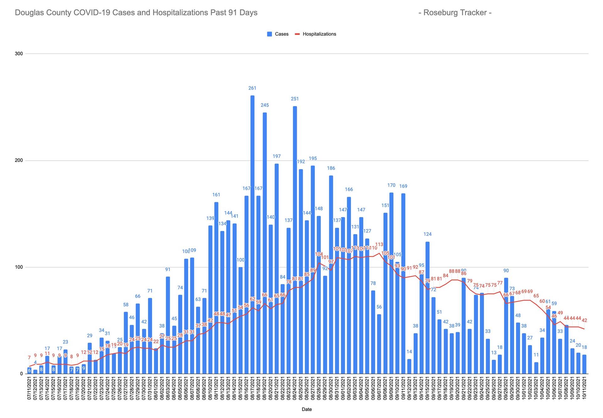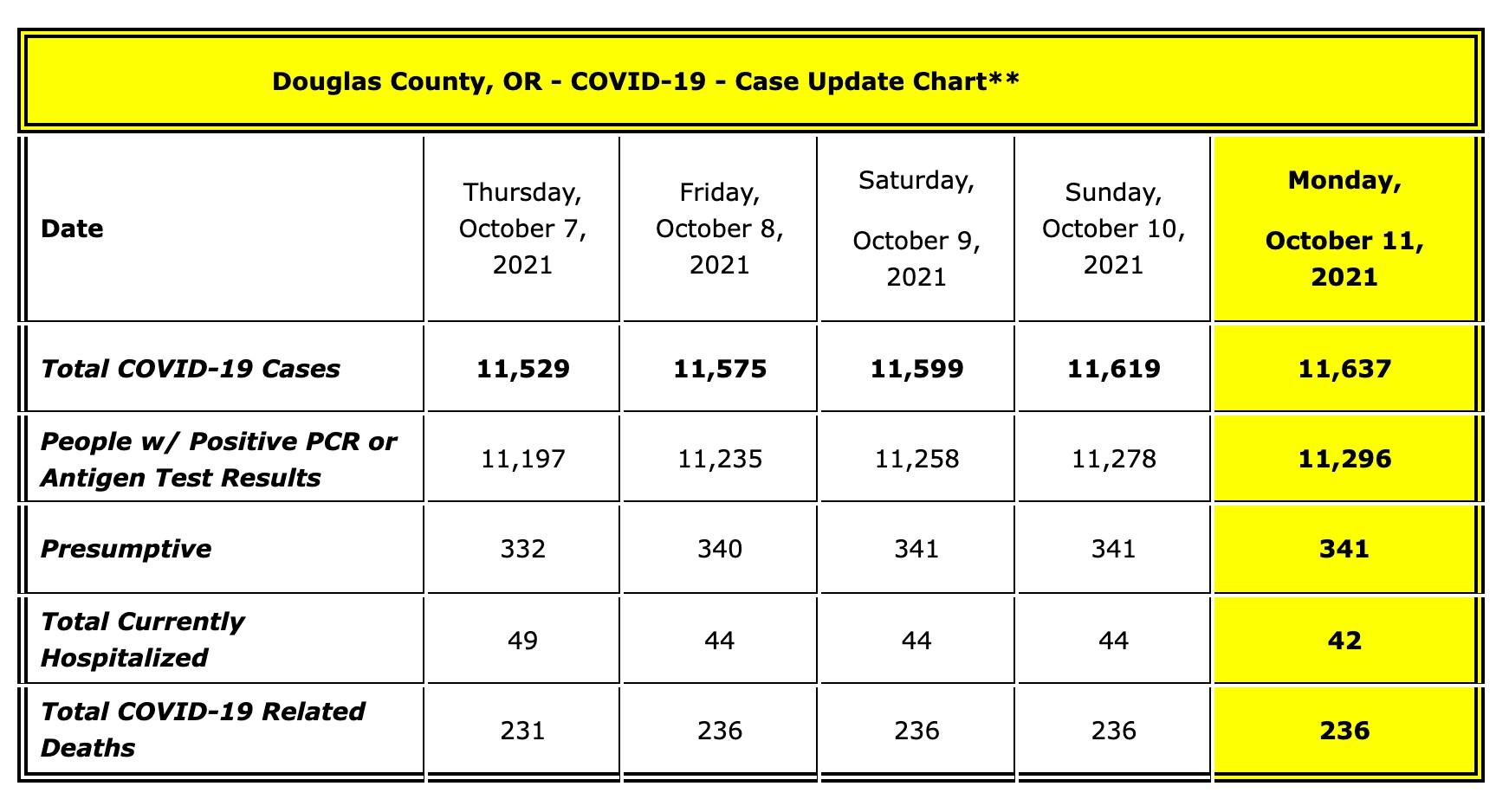 As of 12:00 pm today, Monday, October 11, 2021, there are EIGHTEEN (18) people with new positive test results to report, bringing the total number of cases of people with positive test results and presumptives in Douglas County to 11,637*. Currently, there are FORTY-TWO (42) Douglas County COVID-19 patients that are being hospitalized, twenty-six locally and sixteen out-of-the-area, including one that has been transferred out of the state for specialized care not available here. We continue to work with Mercy to provide information on our COVID patients being hospitalized locally: 5 COVID positive patients are in the Intensive Care Unit (ICU) and 3 are in the Progressive Care Unit (PCU). Of our hospitalized cases today, THIRTY-NINE (39) patients out of the 42 patients are not fully vaccinated. COVID-19 WEEKEND RECAP FOR SATURDAY, OCTOBER 9 AND SUNDAY, OCTOBER 10, 2021 On Saturday, October 9, 2021, at 12:00 pm we had TWENTY-THREE (23) people with new positive test results and ONE (1) new presumptive to report bringing our total number of cases of people with positive test results and presumptives in Douglas County to 11,599*. We had FORTY-FOUR (44)Douglas County COVID-19 patients hospitalized, thirty locally and fourteen out-of-the-area, including one patient that has been transferred out of the state for specialized care not available here. Due to the decrease in cases, Mercy is able to take a step back from their weekend reporting for COVID-19 patients being hospitalized locally, so we will not be reporting weekend statistics. Of our hospitalized cases on Saturday, FORTY (40) patients out of the 44 patients were not fully vaccinated. On Sunday, October 10, 2021, at 12:00 pm we had TWENTY (20) people with new positive test results to report bringing our total number of cases of people with positive test results and presumptives in Douglas County to 11,619*. We had FORTY-FOUR (44) Douglas County COVID-19 patients hospitalized, thirty locally and fourteen out-of-the-area, including one patient that has been transferred out of the state for specialized care not available here.Due to the decrease in cases, Mercy is able to take a step back from their weekend reporting for COVID-19 patients being hospitalized locally, so we will not be reporting weekend statistics. Of our hospitalized cases on Thursday, FORTY (40) patients out of the 44 patients were not fully vaccinated. ACCESS TO LOCAL COVID-19 RESOURCES Local Online Access to Updates: Stay up to date with accurate and local COVID-19 information by visiting the Douglas County Government Website or DCGOV Facebook page or the DPHN Website or DPHN Facebook page. Free Local e-Newsletter Subscription: You can also sign up for the free Douglas County e-Newsletter that publishes and sends out the update to our subscription base. Log onto: www.co.douglas.or.us. Douglas County COVID-19 Hotline (541) 464-6550: Your Douglas County Board of Commissioners and DPHN continue to offer a local resource hotline for Douglas County residents for COVID-19. The hotline provides answers to frequently asked questions, basic COVID information and referrals to local resources and services. Our local hotline number is (541) 464-6550 and is staffed from 8:00 am to 5:00 pm, 7 days a week. DPHN Vaccine Information: Want more information on the vaccines? Log onto: http://DougCoVaccine.com. DPHN Informational Videos: Check out DPHN’s YouTube Channel for informational videos about COVID-19. Douglas County Tiger Team: The Tiger Team organizes our county-wide COVID-19 vaccine program via free pop-up vaccine clinics, with Umpqua Valley Ambulance, who provide a certified vaccinator and medical assistant. The clinics are open to anyone 18 years of age and older, and preregistration is not required. Click here for the calendar of upcoming clinics or call (541) 670-3110 or (541) 464-6550, if you are interested in having team come to your location. Aviva Health: Aviva is offering fee-based leisure COVID-19 testing at its drive-through testing clinic at located at 4221 NE Stephens Street, Suite 101A, in Roseburg, Monday through Friday, from 8:30 am to 11:30 am and 1:00 pm to 4:30 pm to individuals who require a negative test for travel, public events such as college football games, return to work, and other non-medically necessary purposes. Rapid BINAX tests are $60, and PCR tests are $35. Aviva Health continues to offer no- and low-cost COVID-19 tests to people with symptoms by billing their insurance or for uninsured individuals charging on an income-based, sliding-fee scale. Testing is by appointment only. Community members may schedule a testing appointment by calling (541) 492-2067. They continue to offer free drive-through COVID-19 vaccination services to patients and non-patients. Patients must be Douglas County residents and be 12 years of age or older***. Vaccinations are also available on a limited basis at Aviva Health’s outlying clinics in North County, Sutherlin, Glide, and Myrtle Creek. People seeking vaccinations at their outlying clinics should call (541) 672-9596, to determine availability. For more information please visit www.aviva.health/covid-19-resources/. Aviva also has an online COVID FAQ page with answers to frequently asked questions. Lower Umpqua Hospital District: Lower Umpqua Hospital District has a COVID-19 Vaccine Call Center for COVID-19 vaccine information in the Reedsport area. Call (541) 271-2175, Monday through Friday from 9 am to 4 pm. Cow Creek Health and Wellness Center: Cow Creek testing and vaccination sites will be CLOSED on Monday, October 11, 2021 in observance of Indigenous Peoples’ Day/Columbus Day. Effective Tuesday, October 12, 2021, Cow Creek Health and Wellness Center will no longer offer community testing. Testing will be available by appointment only for Cow Creek Health and Wellness Center patients, Tribal Members, employees of Cow Creek Government Offices and affiliated businesses at the new Roseburg Clinic at 2589 NW Eden