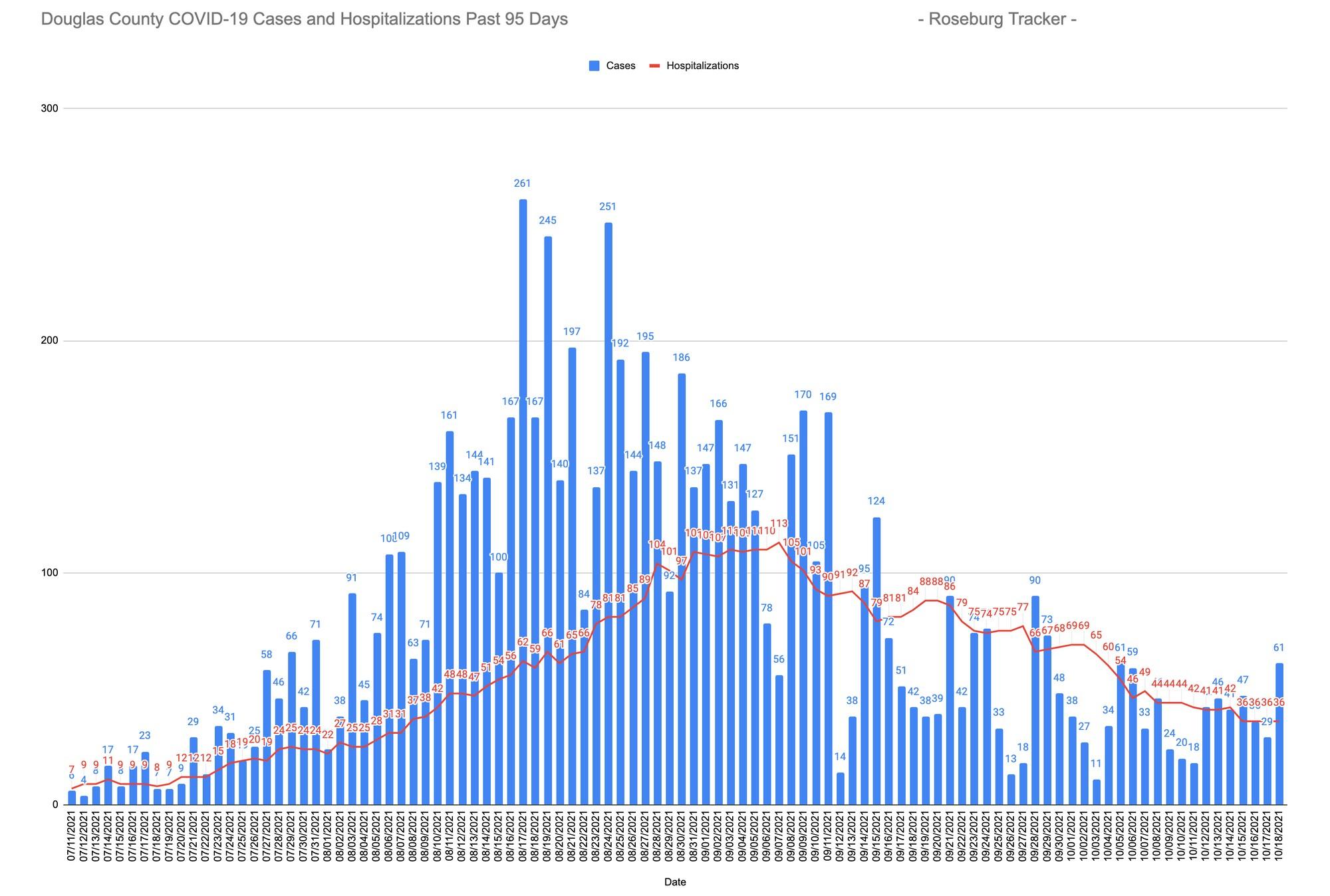 As of 12:00 pm today, Monday, October 18, 2021, there are SIXTY-ONE (61) people with new positive test results to report bringing the total number of cases of people with positive test results and presumptives in Douglas County to 11,939*. Currently, there are THIRTY-SIX (36) Douglas County COVID-19 patients that are being hospitalized, twenty-two locally and fourteen out-of-the-area, including one that has been transferred out of the state for specialized care not available here. We continue to work with Mercy to provide information on our COVID patients being hospitalized locally: 4 COVID positive patients are in the Intensive Care Unit (ICU) and 4 are in the Progressive Care Unit (PCU). 12% of the total hospitalized patients at Mercy are COVID positive. Of our hospitalized patients today, TWENTY-NINE (29) of the 36 patients are not fully vaccinated. On Saturday, October 16, 2021, at 12:00 pm we had THIRTY-TWO (32) people with new positive test results, FOUR (4) new presumptives and ONE (1) new COVID-19 related death to report bringing our total number of cases of people with positive test results and presumptives in Douglas County to 11,849*. We had THIRTY-SIX (36)Douglas County COVID-19 patients hospitalized, twenty-three locally and thirteen out-of-the-area, including one patient that has been transferred out of the state for specialized care not available here. Due to the decrease in cases, Mercy is able to take a step back from their weekend reporting for COVID-19 patients being hospitalized locally, so we will not be reporting weekend statistics. Of our hospitalized cases on Saturday, October 16, 2021, THIRTY-THREE (33) of the 36 patients were not fully vaccinated. On Sunday, October 17, 2021, at 12:00 pm we had TWENTY-EIGHT (28) people with new positive test results and ONE (1) new presumptive to report bringing our total number of cases of people with positive test results and presumptives in Douglas County to 11,878*. We had THIRTY-SIX (36)Douglas County COVID-19 patients hospitalized, twenty-three locally and thirteen out-of-the-area, including one patient that has been transferred out of the state for specialized care not available here. Due to the decrease in cases, Mercy is able to take a step back from their weekend reporting for COVID-19 patients being hospitalized locally, so we will not be reporting weekend statistics. Of our hospitalized cases on Sunday, October 17, 2021, THIRTY-THREE (33) of the 36 patients were not fully vaccinated. COVID-19 RELATED DEATH OF A DOUGLAS COUNTY RESIDENT Douglas County Public Health has confirmed the death of one more Douglas County resident related to the COVID-19 virus. Our two hundred and forty-second COVID-19 related death was an 81-year-old woman who was diagnosed with COVID-19 on Tuesday, September 28, 2021 and passed away on Friday, October 15, 2021. She was partially vaccinated. In the interest of privacy for the loved ones of this resident, and as our ethical responsibility to follow all medical laws, no additional information will be released. We thoroughly scrutinize and investigate all deaths, and review all medical records to make sure that everyone we report has met the requirements for a COVID related death, as per the Oregon Disease Investigative Guidelines for COVID-19. Each death related to COVID-19 is painful for all Douglas County residents, and a sad reminder of the terrible impact COVID-19 has had in our local communities. The Douglas County Board of Commissioners, Dr. Dannenhoffer, DPHN and the DCCRT team extend our heartfelt condolences and sympathies to all family members, friends, relatives, co-workers and community members of those who have passed after contracting this deadly virus.
