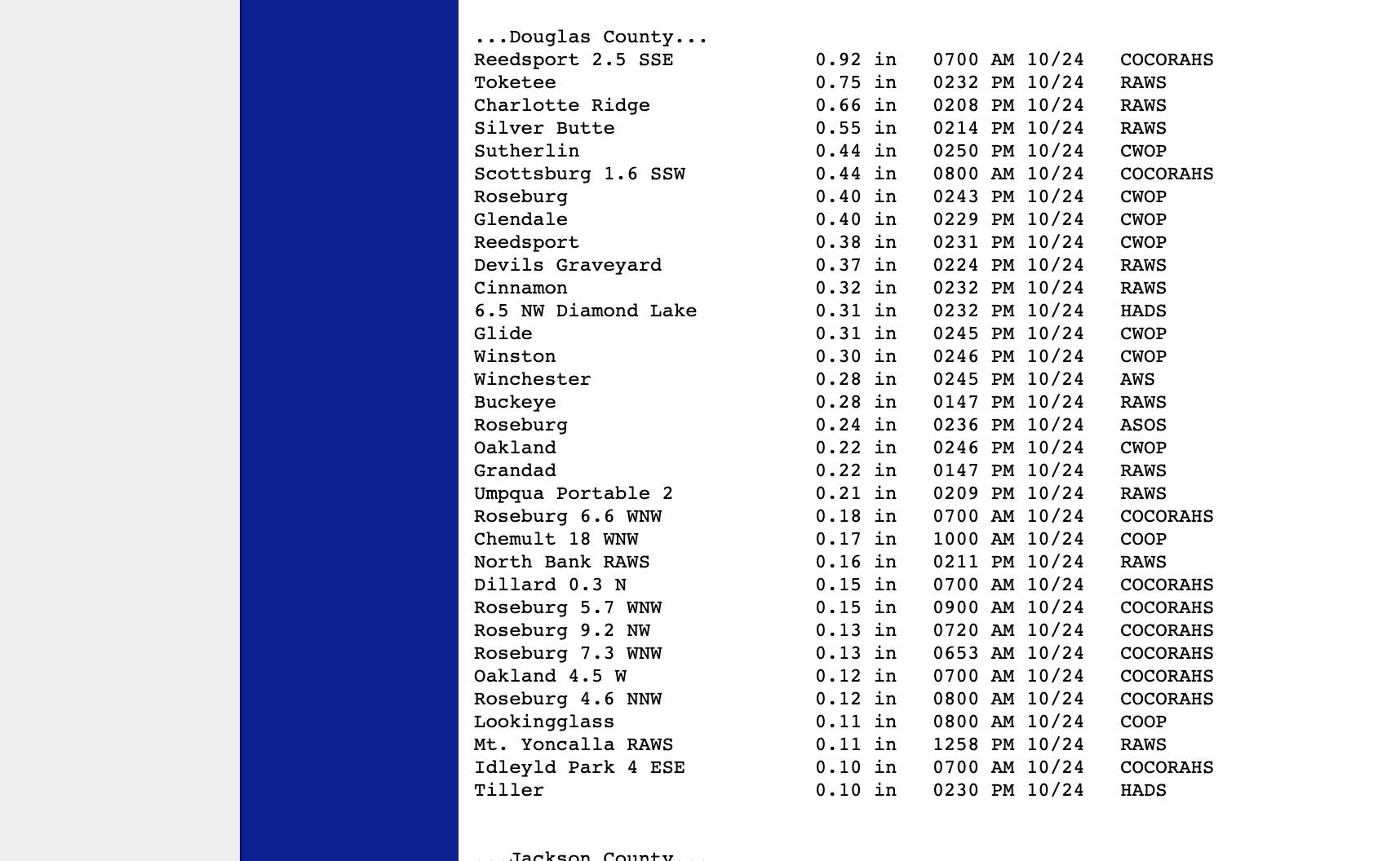 Here are the 24 hr rainfall totals for Douglas County and the highest recorded wind speeds over the past 24 hours. Roseburg and Sutherlin both got almost a half-inch of rain. Winds in Yoncalla reached almost 50 mph and in Roseburg, it was about 25 mph.
