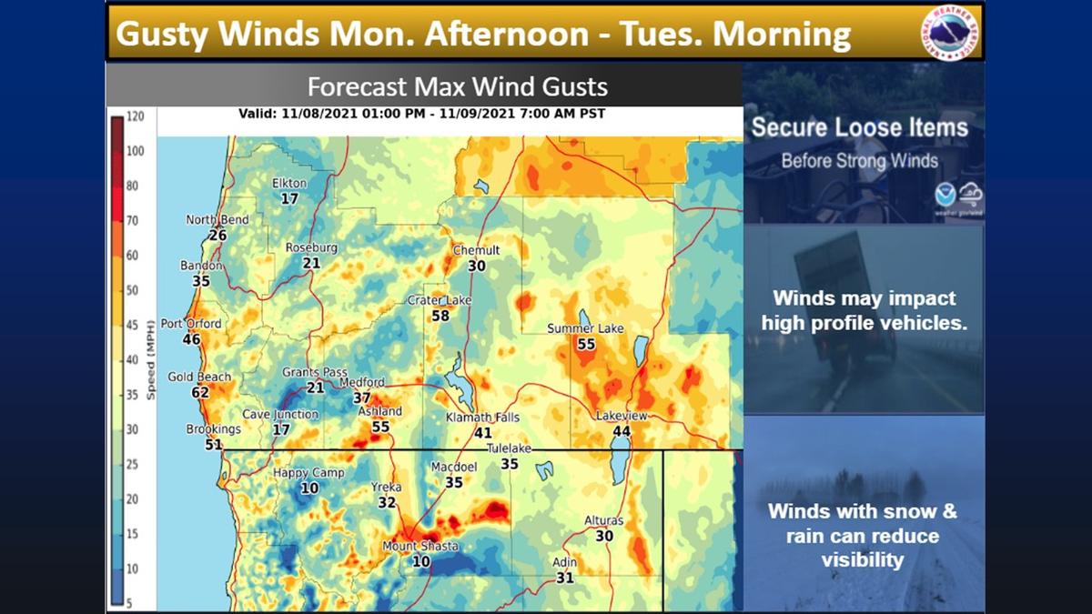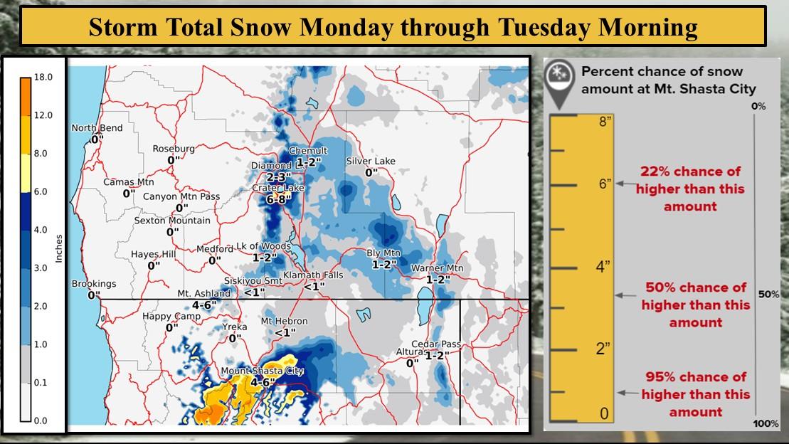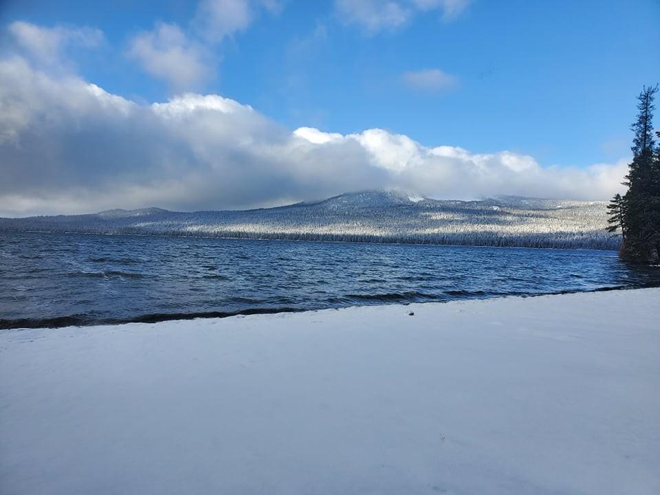 NWS in Medford is calling for as much as 8 inches of snow up at Crater Lake and 2-3 inches at Diamond Lake. "With a relatively cold air mass in place, we expect some snow at many mountain passes on Monday into Tuesday morning. Amounts of 4-8 inches seem likely above 4000 feet in the Siskiyou and Cascade Mountain ranges, with 12 inches possible above 6000 feet in the Mt. Shasta region. Snow levels could drop locally lower around Mt. Shasta City (down to around 3500 feet), so we`ve included an advisory for I-5, amounts at Mt. Shasta City could be around 2-3 inches. All the details of the wind/winter storm warnings/advisories can be viewed at NPWMFR and WSWMFR." Here is the full forecast discussion from NWS in Medford: https://www.wrh.noaa.gov/total_forecast/getprod.php?new&prod=XXXAFDMFR&wfo=mfr Photos of Diamond Lake by Ginger Finch, taken Sunday morning. Diamond Lake had 1-2 inches of snow this morning according to Finch.