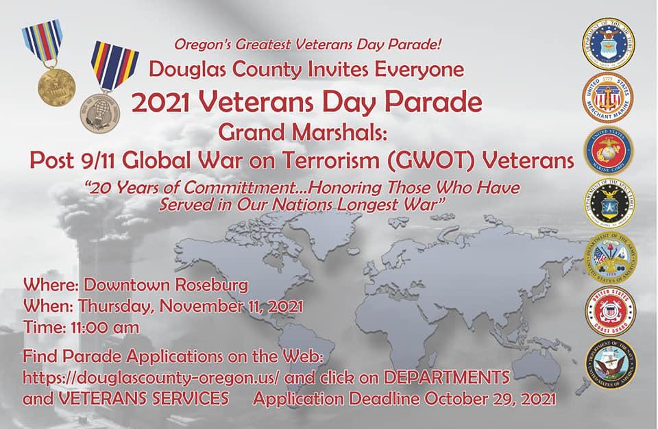 What- 66th Annual Douglas County Veterans Day Parade When- Thursday, 11 am, November 11, 2021 Where- Downtown Roseburg, on NE Jackson Street and SE Main Street Who- All Veterans/Military and all citizens that want to recognize and honor them • Grand Marshals: Post 9/11 Global War On Terrorism (GWOT) Veterans Why- To thank and honor all those who put on the uniform and served honorably in the military • Theme: “20 Years of Commitment…Honoring Those Who Have Served in Our Nation’s Longest War” How- We encourage citizens, schools, businesses, civic organizations, Veterans, and their families to not only come to the parade but also to consider entering a float, to show your patriotic spirit and appreciation. The application can be found at; https://douglascounty-oregon.us/.../2021-Parade-Application Remember, only registered entries are allowed on the parade route and it only costs $5. Floats registered by October 29th are eligible to be judged for recognition awards. Late or same-day entries are allowed, but are not eligible for judging. Be sure to start your plans early. Via Dan Loomis