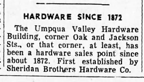 On 20 Aug 1884, a devastating fire destroyed Roseburg’s Metropolitan Hotel and many other surrounding downtown businesses. One of those was the Sheridan Brothers Hardware Store, built originally in 1872. The owners quickly rebuilt, but wisely this time with brick. The red brick building, on the corner of SE Jackson and SE Oak, in downtown Roseburg was one of the earliest brick structures, built in Roseburg (1884-1885). Contrary to some historical claims, it wasn’t the first downtown structure built with brick. A Roseburg Fire Department report, on the Metropolitan Hotel Fire, references other brick structures nearby. The new brick hardware store was constructed by R.S and J.S. Sheridan, who were the original proprietors of the Hardware Store. The Sheridan brothers were the sons of Thomas Patrick Sheridan, a pioneer businessman in Roseburg. By 1893, the Sheridan brothers had sold their business to Churchill (Frank), Wooley, and McKenzie. In 1898, McKenzie sold his share of the business to the other two partners. In 1910 Frank Churchill sold his share of the hardware store to Thomas L. Wharton and Glen G. Goodman. For a time, the hardware store was the second largest hardware store between Portland and San Francisco, and occupied one of the busiest intersections of Roseburg. A 1932 newspaper story noted that the location had been a hardware store for over 60 consecutive years. In 1987, the front façade of the structure was restored with red brick to approximate its original configuration. The long south wall of the building is in its original condition; two long narrow steel doors cover apertures near the southeast corner. The building was later divided to accommodate four small businesses. In the early 1980s, my mother operated a small plaster figurine shop in the basement floor of this building. Maybe you remember some of the businesses that have operated within these brick walls? #douglascountyoregon