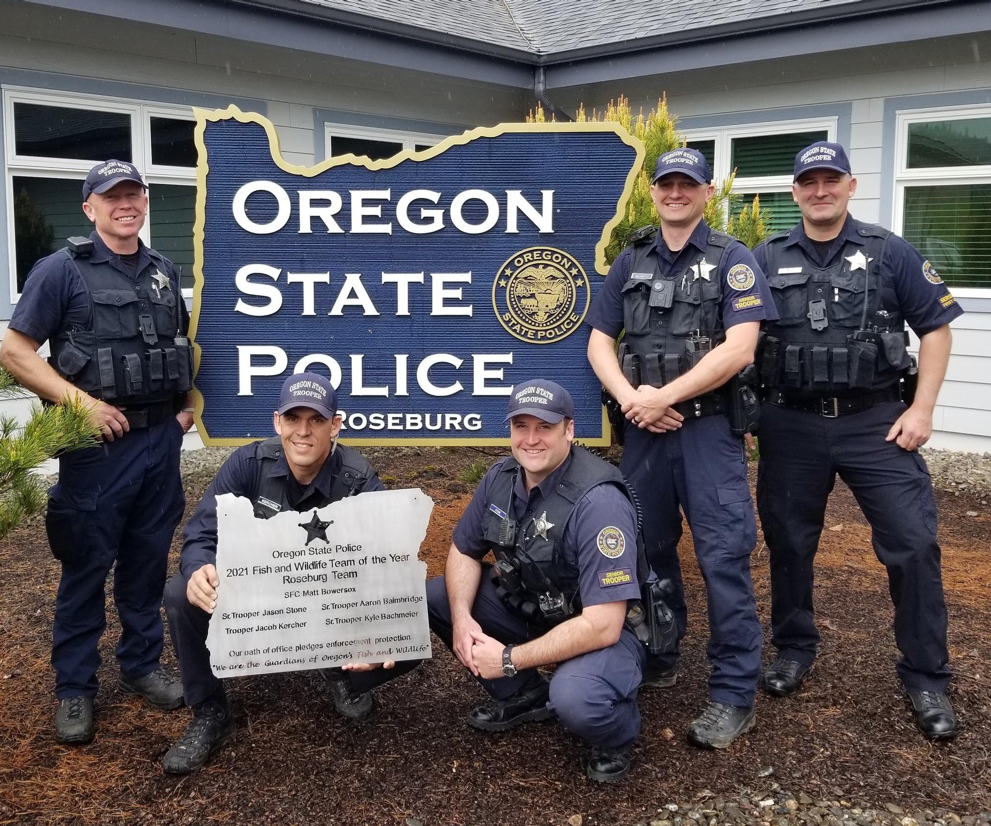 The Oregon State Police is pleased to announce that the Fish & Wildlife Team of the year for 2021 goes to the Roseburg Fish & Wildlife Team. The team was presented with the award last week at the Roseburg Area Command. The team is comprised of members from the Roseburg office, led by Sergeant First Class Bowersox. The team members are Senior Trooper Bachmeier, Senior Trooper Baimbridge, Senior Trooper Stone, and Trooper Kercher. The nomination of the Roseburg team noted their professionalism, and initiative, and described them as “the epitome of the Oregon State Police’s values: honor, loyalty, dedication, compassion, and integrity.” In early 2021, the Roseburg team brought to close a multi-year investigation into a prolific poacher with the execution of a search warrant on the subject and his residence. As a result of the search warrant and investigation, multiple charges were brought forth on the subject. Throughout 2021, the Roseburg team conducted effective enforcement by boat patrols, WEDs, night flights, and patrolling on horseback. The team also participated in multiple public outreach events, assisted with Search & Rescue incidents, and had several boat recoveries on the Umpqua River system. When you look at the criteria for this award: professionalism, teamwork, mentorship, leadership, dedication to protecting Oregon’s citizens and natural resources, going above and beyond the call of duty, and thinking outside the box to address issues; the Roseburg team exemplifies all of these traits. Join us in congratulating and thanking the Roseburg Fish & Wildlife Team for all of their hard work and dedication. They are an outstanding representative of this award, the Division, and the entire Oregon State Police. Via Oregon State Police