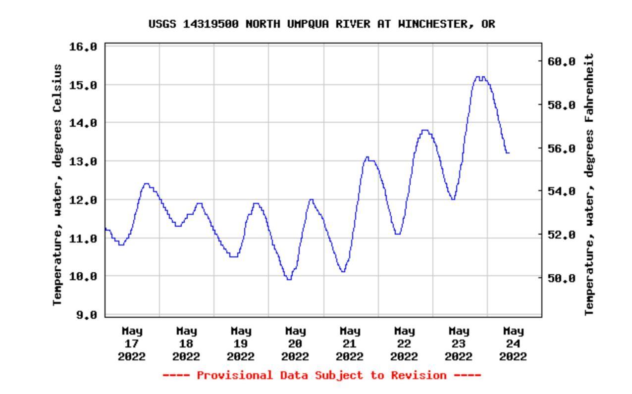 Air temperatures are going to be near 80 degrees today and almost 85 degrees tomorrow! Just a reminder to be cautious around the rivers as the water is still very cold. The North Umpqua River is still in the '50s.