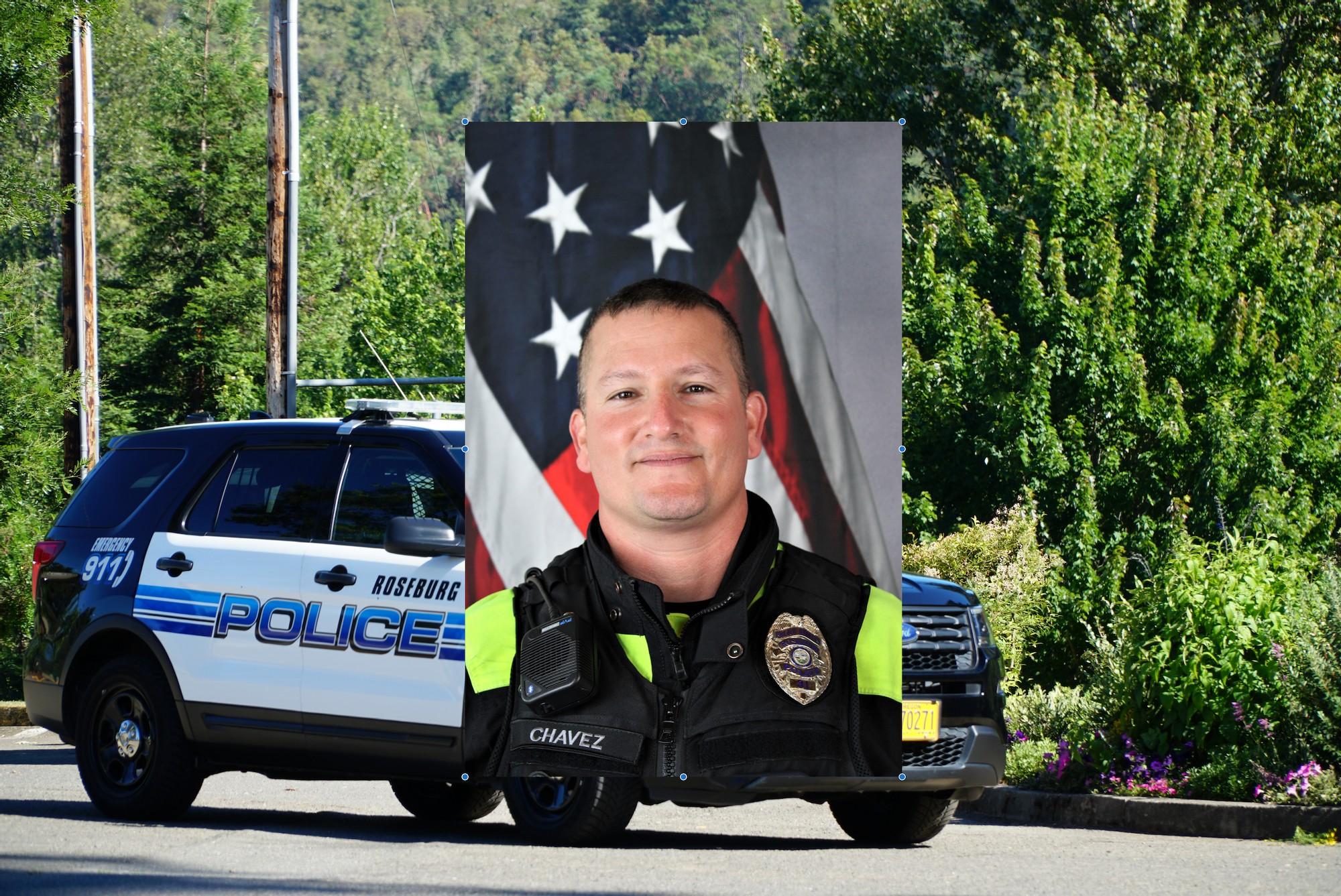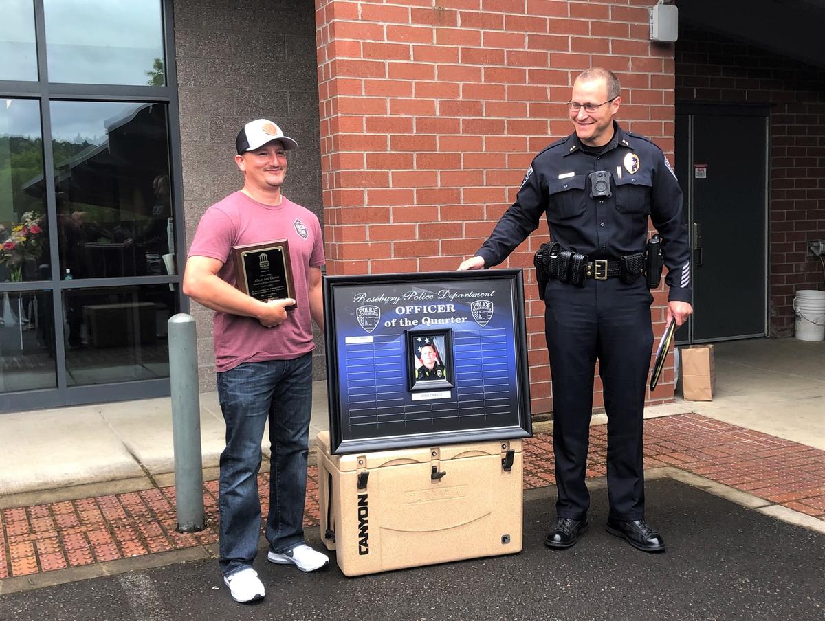 Roseburg Police Department Motor Officer and Homeless Liaison Josh Chavez was recently named the 2021 Roseburg Optimist Club Officer of the Year for his commitment, professionalism and outstanding service. Chavez was honored with the Officer of the Year award at a BBQ lunch at Roseburg Police Department Friday, May 27. At the same time, Roseburg Police Chief Gary Klopfenstein recognized Officer Chavez with the department’s “Officer of the Quarter” Award for the first quarter of 2022. In his remarks at the event, Chief Klopfenstein thanked the Roseburg Optimist Club for recognizing the hard work and dedication of all Roseburg Police Officers. “Every year, there are many officers who stand out for their outstanding performance - making it very difficult to select a single officer for recognition. With that said, one really stood out this year among our outstanding police officers and employees in the Roseburg Police Department,” Chief Klopfenstein said at the BBQ outside the Roseburg Public Safety Center. Roseburg Optimist Club President Peter Sudduth and other members of the club presented Officer Chavez with the award. Officer Chavez has served with Roseburg Police since June 2013 and has worked as a patrol officer, training officer, motor officer and, currently, as a homeless liaison officer. As a motor officer, Officer Chavez rides a motorcycle and provides traffic patrol and accident response. “Josh is extremely deserving of this award. He shows up to work with a positive, ‘can-do’ attitude and is always the first to offer assistance when you need it. He is calm under pressure and demonstrates the utmost professionalism to the public we serve,” said Chief Klopfenstein, adding that he’s proud to work with the officer and that Officer Chavez’s positive attitude infects those around him. “Josh’s exceptional work ethic sets an example for others at RPD to follow and he is valued as a dedicated and dependable member of the Roseburg Police Department,” added Chief Klopfenstein. Via City of Roseburg