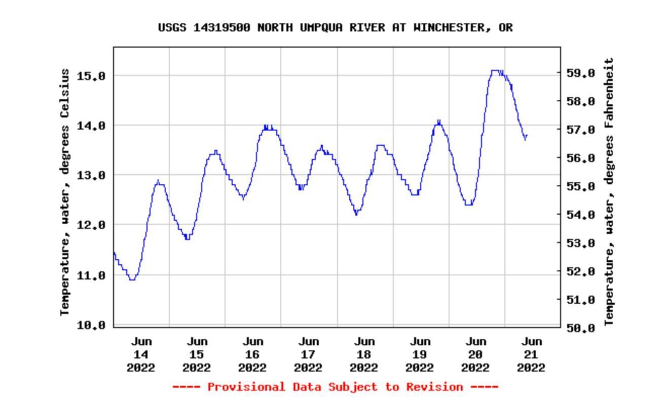 Be very careful around the rivers this week into next. Air temperatures are going to get up into the '90s on Saturday, Sunday, and Monday most likely but the North Umpqua River is still in the high 50s. That is very cold and people need to be very cautious around the water right now. For perspective on how unusual this is to have the river be this cold this late, in 2019 the North Umpqua River was almost 74 degrees by June 12th or so! Tips from the National Weather Service: Body heat can be lost 4 times faster in cold water than in cold air. Wearing a life jacket significantly increases chances of survival. Cold shock can be just as severe and dangerous from water temperatures of 50-60F (10-15C) as it is from water at 35F (2C). Gasping for a breath or rapid breathing from sudden immersion can be triggered by water as warm as 77F (25C).