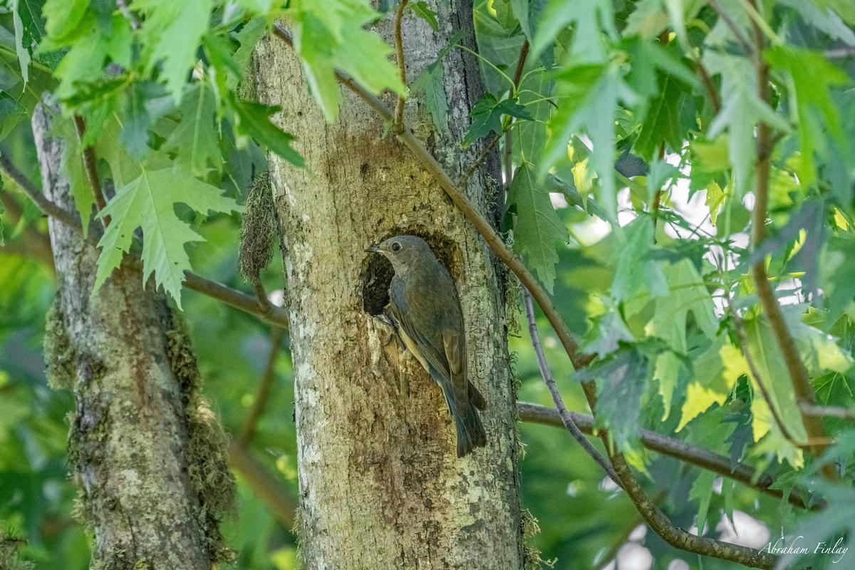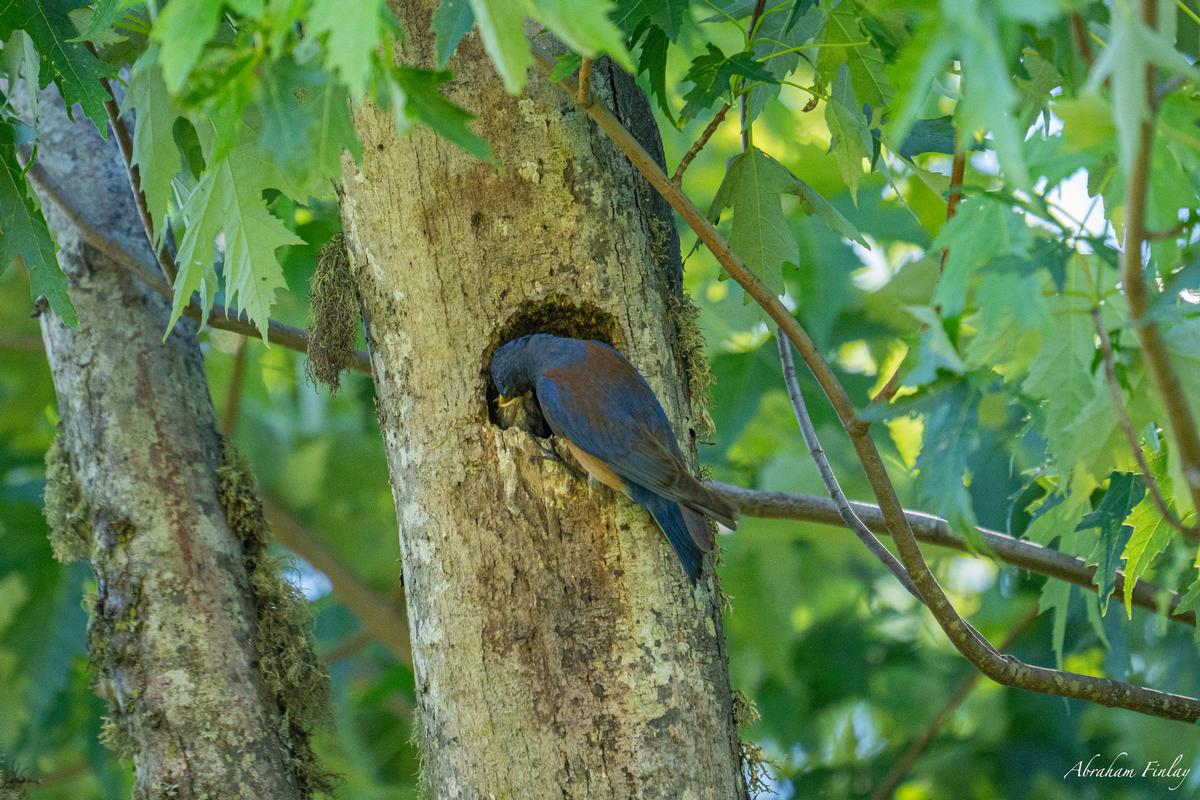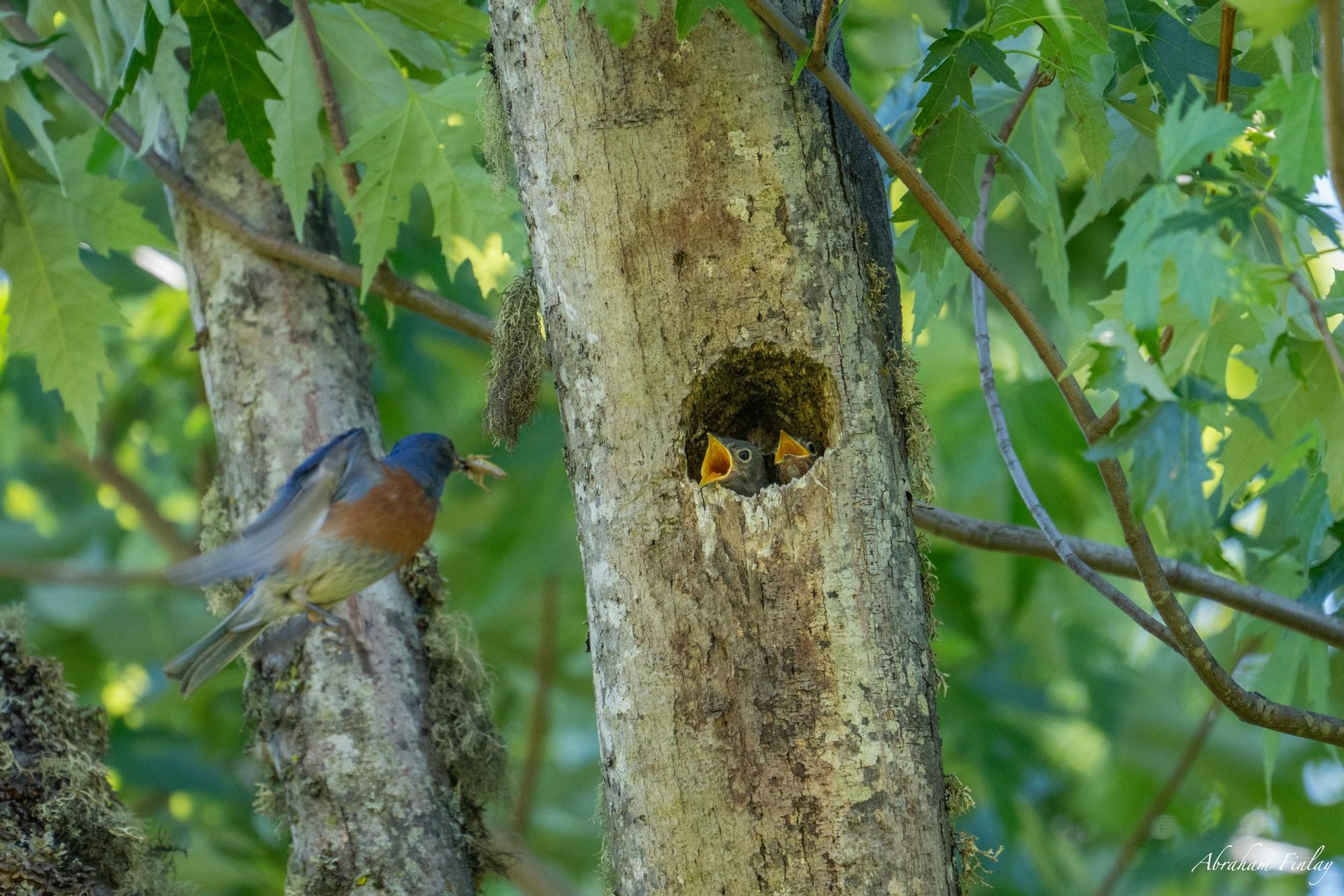 While out birdwatching late this morning I came across this Western Bluebirds nest in a small cavity in an old tree. I sat for a while and observed as the parents went back and forth from a nearby field to the nest with food for the chicks, mostly grasshoppers, beetles, and caterpillars.