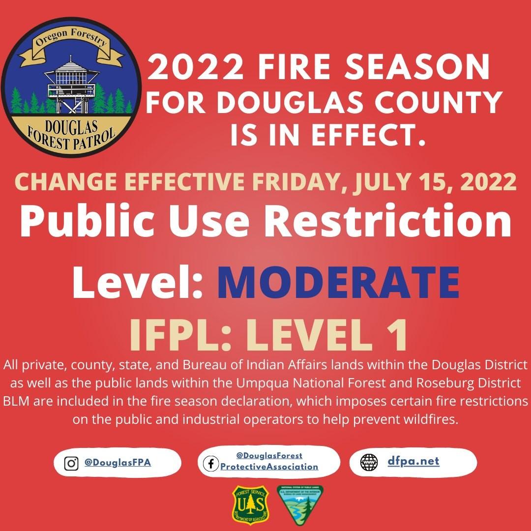 Effective Friday, July 15, 2022, Public Use Restriction Levels will change to MODERATE for all private, county, state, and Bureau of Indian Affairs lands within the Douglas District as well as the public lands within the Umpqua National Forest and Roseburg District BLM are included in the fire season declaration, which imposes certain fire restrictions on the public and industrial operators to help prevent wildfires, and have specific Fire Prevention Orders or other public use restrictions on the BLM- and UNF-administered lands. For further information on the BLM managed lands please visit: https://www.blm.gov/orwafire There are no current applicable changes to IFPL (Industrial Fire Precaution Level) levels within the Douglas District. IFPL will remain at LEVEL 1. What does this mean to the public? Non-industrial power saw usage, cutting, grinding, or welding of metal, cutting, trimming, or mowing of dried, cured grass, power driven machinery for non-industrial improvement or development on private property will only be allowed BEFORE 1 PM or AFTER 8 PM.