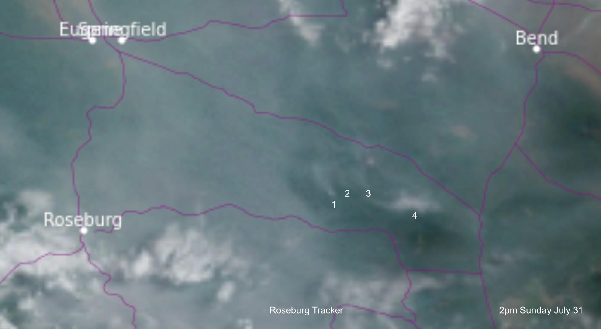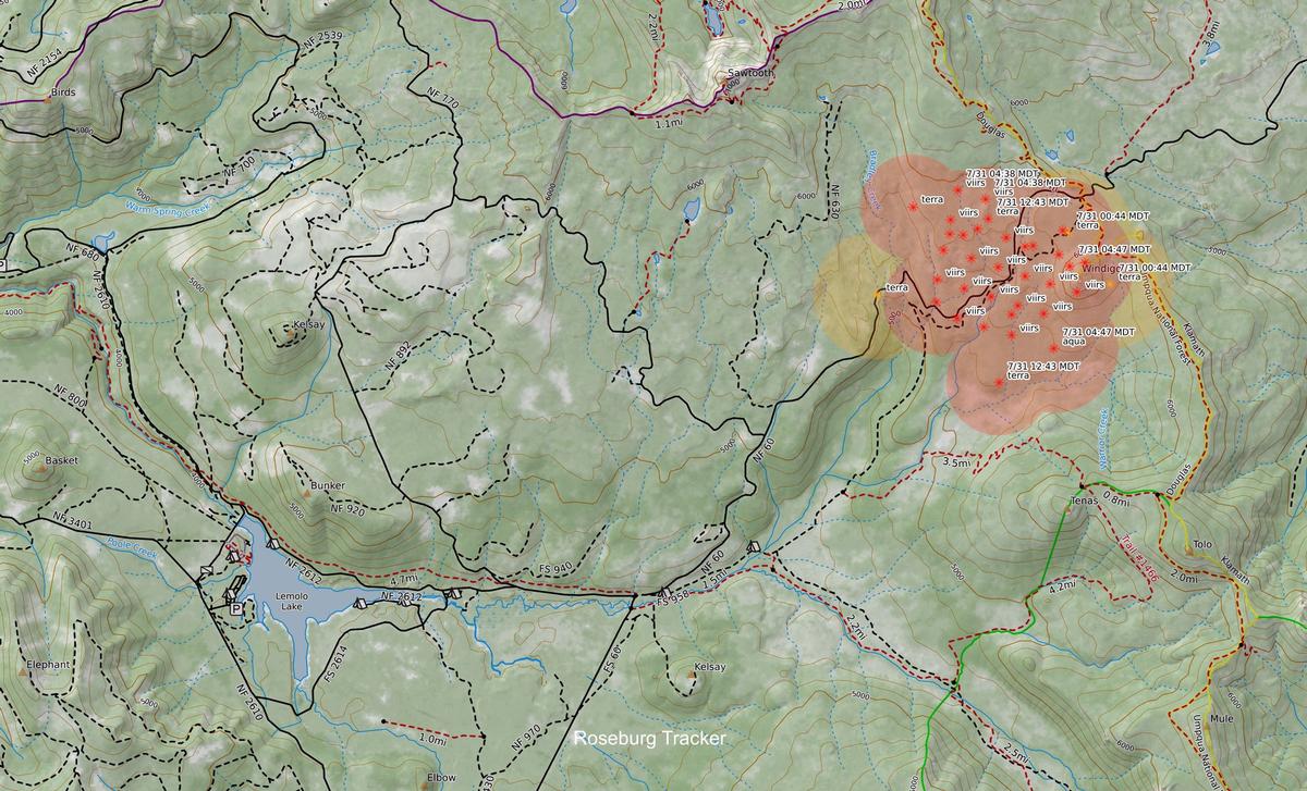 Smoke is still showing up from the two fires burning up by Diamond Lake on Sunday morning. I'm not seeing aircraft on these two fires now so I believe it's just hand crews working them today after an initial air attack on them yesterday. A red flag warning is still in effect for a large portion of eastern Douglas County. Thunderstorms are likely to be seen again Sunday into Monday. Air quality in Roseburg is still good as of Sunday morning, but deteriorates the further you go east. You can monitor the air quality here: https://gispub.epa.gov/airnow/?contours=ozonepm&monitors=none&xmin=-14175705.517655635&xmax=-13254180.704649596&ymin=5173268.820976867&ymax=5521210.173730972 Update 1pm July 31 from Umpqua National Forest: "Suppression efforts are underway for the Windigo Fire, which began yesterday afternoon in the Windigo Pass area off Forest Service (FS) Road 60 on the Douglas and Klamath county divide. Ground and aviation resources responded quickly to the fire which is actively burning in timber. The fire remained active overnight and is now estimated to be greater than 100 acres. This number is expected to increase as information becomes available. Today’s efforts will focus on identifying and establishing primary containment line as part of the full suppression response to the fire. Firefighters are also responding to several reports of additional fires on the Forest including the smaller Forebay Fire, just north of the Lemolo 1 Forebay. Response capacity remains high with multiple resources staged and ready to engage with any new starts. Current resources include two water tenders, four engines, two crews and aircraft. Earlier today, a helicopter from the Windigo Fire detected a new fire burning a few miles north on Potter Mountain on the Willamette National Forest. Light to moderate smoke impacts are anticipated in the Windigo Fire area and from other new starts. A red flag warning is in effect for a significant portion of eastern and southern Oregon due to scattered thunderstorms and fire weather. This includes portions of the Umpqua National Forest. A closure for public safety is currently underway for a section of the Pacific Crest Trail (#2000) in the vicinity of the fire. Visitors are asked to avoid the general area, including FS Road 60, due to increased fire traffic. The cause of the fire is under investigation. Please help firefighters by being vigilant with fire prevention efforts." Update 2 pm: Appears there is a third and fourth fire as seen from the aircraft activity in the area and satellite imagery. Update 7 pm: “ Here is an update on the current fire situation on the Umpqua National Forest: There are three confirmed fires: Windigo Fire: Approximately 1,300 acres burning near Windigo Pass. A closure on the Pacific Crest Trail (PCT) and Forest Service (FS) Road 60 is underway. Forebay 1 Fire: Approximately 4 acres just north of Lemolo 1 forebay Fire 237: ½ acre located northwest of Lemolo 1 forebay Several FS Roads, trails, and campgrounds are closed and an official Emergency Fire Closure is in progress: FS Road 2610 – closed from Lemolo Dam to Calapooya Mt. (at the Forest boundary) FS Road 60 – closed from the junction with Kelsey Valley Rd to Forest boundary (Deschutes NF has a closure on the east side) Trail 1412 – Windigo Pass Trail 1445 - Tenas Peak Trail Pacific Crest Trail – Closed between State Hwy 138 (PCT mile 1,848) to State Hwy 58 (PCT mile 1,908). A Type 2 incident management team has been ordered to manage these fires in addition to the Potter Fire on the Willamette National Forest. Additional firefighting resources are also on order. A Temporary Flight Restriction (TFR) is in place over the fire areas.” US National Forest Umpqua National Forest