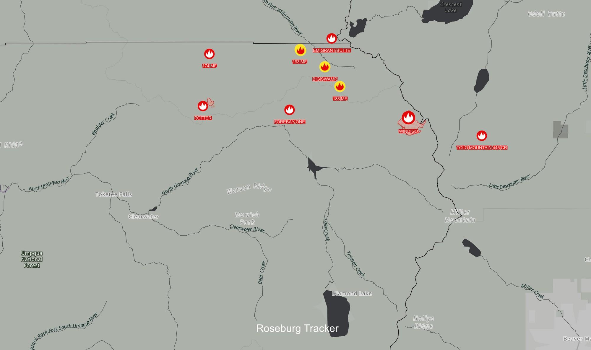 Here is the latest on the two largest fires up near Diamond Lake from the NWCC. Windigo. OR-UPF-000234. ICT3. 20 miles SW of La Pine, OR. Start 7/30. Full Suppression. Cause: Unknown. 1,300 acres (+0). 0% containment. Timber. Active fire behavior. Evacuations in effect. Road, trail and area closures. IMT2, NW Team 6 (Sheldon) assumed command at 0600 today to manage Potter and Windigo incidents. Potter. OR-WIF-220170. ICT3. 8 Miles NE of Clearwater, OR. Start 7/31. Full Suppression. Cause: Lightning. 400 acres (+0). 0% containment. Timber. Moderate fire behavior. Road, trail and area closures. IMT2, NW Team 6 (Sheldon) assumed command at 0600 today to manage Potter and Windigo incidents. No new information received. Here is the latest update from National Forest Service - Umpqua National Forest "The Umpqua National Forest and surrounding areas continue to receive lightning. Approximately 50 strikes were recorded from last night’s storms. Six additional smoke reports were received this morning from lightning with one confirmed fire as of 10:30 am near Brownie Creek in the Tiller area. Douglas Forest Protective Association (DFPA) assisted with detection and response. Nine of the initial attack fires located over the weekend near Lemolo Reservoir have been fully contained, and five of these are also controlled. Additionally, Forebay One Fire is 100% lined as of yesterday at 1:00 pm. All fires are being managed under a full suppression strategy. The Windigo Fire (UPF) and the Potter Mt (WIF) have now been assigned to Northwest Incident Management Team 6. Updates will be provided All other initial attack fires are being managed by the Umpqua National Forest resources. Scattered precipitation was received overnight. Totals included - up to 0.9” at Cinnamon Butte, 0.5” at Diamond Lake, and 0.0” at Toketee Ranger Station. The Forest remains under a Red Flag Warning for lightning until 11:00 pm tonight. Temperatures have cooled slightly on the Forest to the 75-85 degree range, but should climb back up near 90 degrees by the end of week. Fire resources are expected to continue to pick up new starts and holdovers into the near future." ( Via National Forest Service - Umpqua National Forest) LIGHTNING RECON; ANDERSON CREEK FIRE (Via DFPA) Early morning thunderstorms brought in lightning strikes throughout the southern region of the Douglas Forest Protective Association's protection area. At 8:52 am, a DFPA fixed wing aircraft performed lightning reconnaissance over the area of Tiller and Drew. The recon identified one smoke column from a single old growth tree near Brownie Creek Road, in Tiller, ORE. The location of this fire was identified on USFS land, but also bordered private land that fell within DFPA’s jurisdiction. Ground crews from both DFPA and US Forest Service (USFS) responded to the incident and hiked in to assess further. Upon investigation, the ground crews identified that a single, hollowed out snag had been struck by lightning and a small ground fire had started in the area. At 10:50 am, USFS requested fallers and a 10-person crew to respond to the scene. DFPA crews remained on scene to aid in fire suppression. By 11:50 am, the fire was extinguished, the tree was knocked down and teams began mop-up. At 12:21 pm, DFPA crews cleared the scene and left the command to USFS. DFPA will remain in the area to continue lightning recon throughout today and days to follow. For more information about current Public Use Restrictions and Industrial Fire Precaution Levels, visit www.dfpa.net. (Via DFPA)