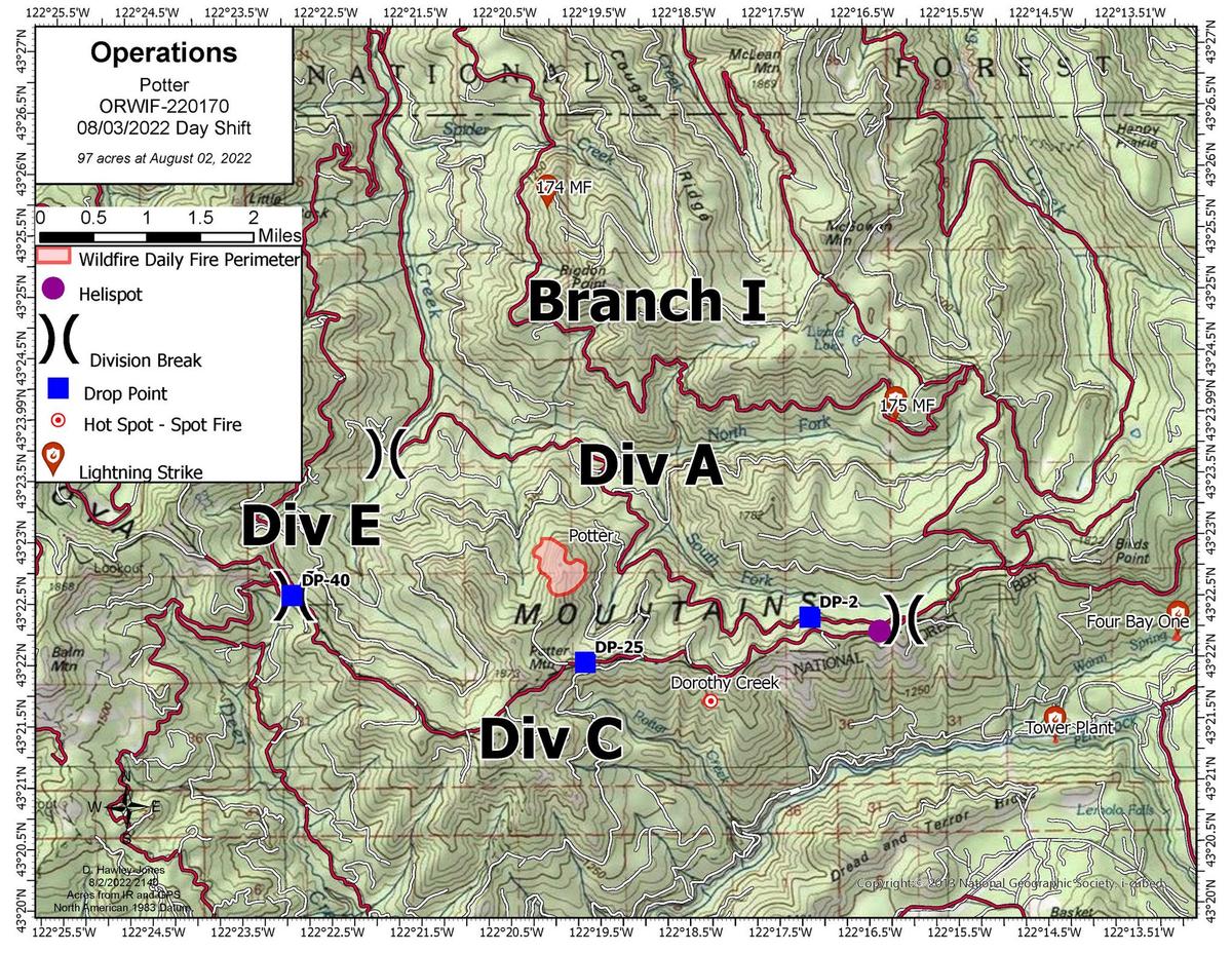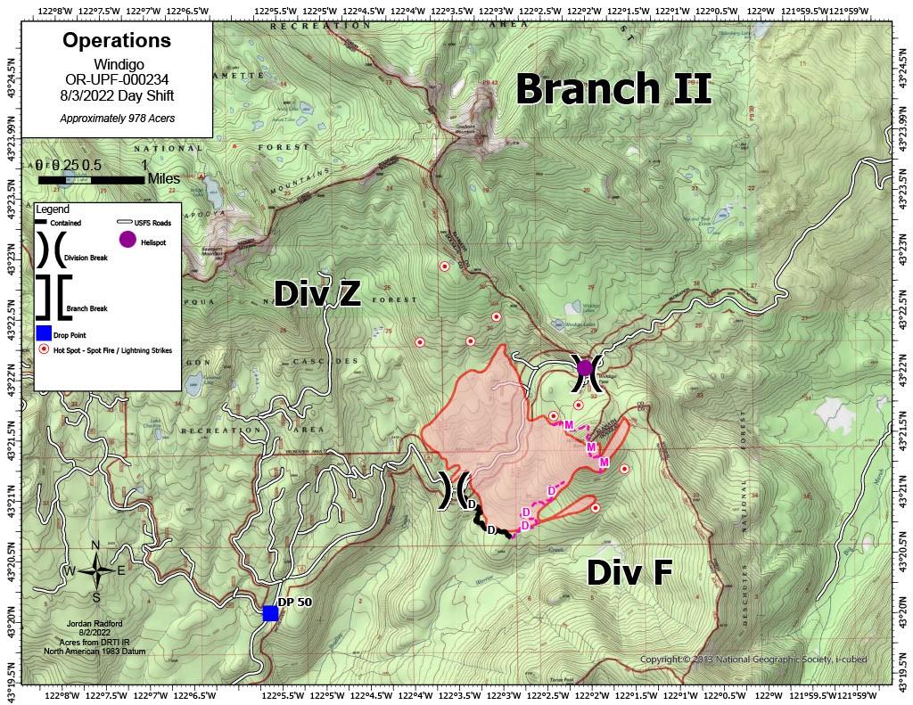 Yesterday, crews and dozers continued to build line around the Windigo and Potter Fires. Road systems are being cleared to be utilized as defensible containment lines. Air and ground resources also worked on initial attack addressing new fire starts in response to Monday night’s lightning storm. One start was located near Little Dome Rock northwest of the Potter Fire. Today, with the arrival of more equipment and staff, crews will continue to prepare primary and alternative fire lines. On the Windigo Fire, dozer line creation will continue at the base of the butte. Handline will be cut on the steeper slopes. On the Potter Fire, crews will continue to prepare Road 2154 and scout for closer, more direct access. Initial attack will continue in both areas with the support of one Type 1 helicopter and one Type 3 helicopter arriving in the afternoon. Fire behavior is expected to be moderate with high temperatures in the mid-80s for both fires. Southwest wind will reach 20-25 mph on ridge tops creating spotting distances of up to ¼ - ½ mile. Smoke will be visible from both fires. Area closures and restrictions include: ● Pacific Crest Trail from OR Highway 58 (north end) to OR Highway 138 (south end); ● Kelsey Horse Camp in the Umpqua National Forest; ● Forest Service Road (FSR) 60 from the junction with FSR 6020 in Deschutes National Forest to FSR 2612 in the Umpqua National Forest; ● Temporary Flight Restriction over the two fires. Windigo Fire Acreage: Approx. 978 acres Containment: 0% Location: 20 miles southwest of La Pine, OR Cause: Under Investigation Potter Fire Acreage: Approx. 97 acres Containment: 0% Location: 8 miles northeast of Toketee area Cause: Lightning Via Northwest Incident Management Team 6