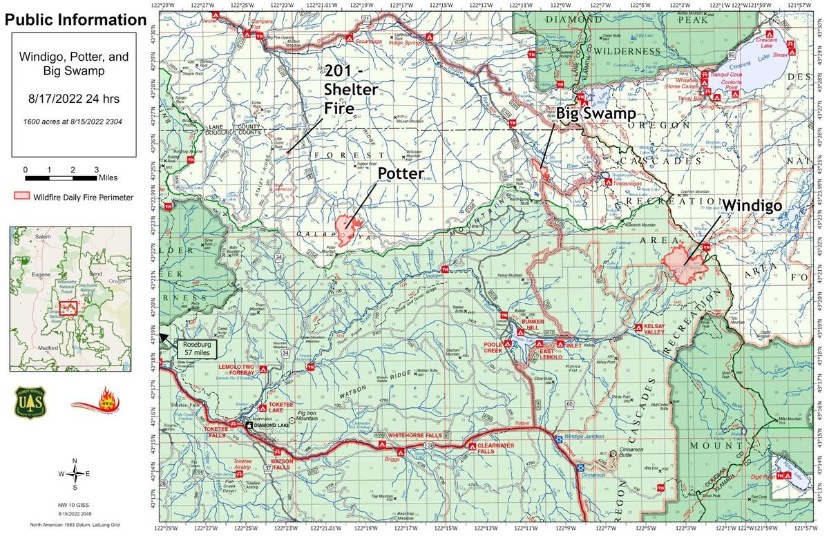 ๐๐จ๐๐๐ฒ: Based on todayโs Red Flag Warning for gusty winds and possible lighting, Incident Commander Alan Lawson reminded firefighters โThe theme for today is situational awareness. Every firefighter needs to be prepared for changing conditions like rolling debris on steep slopes and possible spot fires.โ ๐๐๐๐ญ๐ก๐๐ซ: Red Flag Warning for gusty outflow winds and possible lightning from passing thunderstorm activity Wednesday afternoon and evening. Expect brief heavy rainfall with storm cells. Temperatures in the low 90s with relative humidity 19-20%. For smoke information visit: AirNow.gov. ๐๐จ๐ญ๐ญ๐๐ซ ๐ ๐ข๐ซ๐:Due to moderate fire behavior yesterday, firefighters used bucket drops from helicopters to help protect current firelines and reduce fire spread. Conditions allowed for continued burnout operations. On the south flank of the fire, firefighters are working to clear vegetation away from Forest Road 2154 as an indirect fireline and are scouting for possible opportunities to build firelines on the east flank. ๐๐ข๐ ๐๐ฐ๐๐ฆ๐ฉ ๐ ๐ข๐ซ๐:With minimal fire activity yesterday, firefighters strengthened the line along the east flank of the fire. Efforts to establish a fireline down to the Middle Fork of the Willamette River may include installing a sprinkler system to connect an existing dozer line to the riverbank on the north flank near Forest Road 2153. Mop up operations continue on the south and western portions of the fire. Hose lays are in place around parts of the fire without roads as containment features. ๐๐ข๐ง๐๐ข๐ ๐จ ๐ ๐ข๐ซ๐:Minimal fire activity yesterday remained interior to firelines. Crews continue working closely with resource advisors to limit impacts to sensitive resources and complete repair work across the fire area. Repair work mitigates post-fire damages to cultural resources, protects roads systems from excessive erosion, and provides for public safety. ๐๐๐ฌ๐จ๐ฎ๐ซ๐๐๐ฌ: 20 hand crews, 9 engines, 4 dozers, 6 water tenders, 8 Type 1 helicopters. Total personnel 717. ๐๐ฅ๐จ๐ฌ๐ฎ๐ซ๐๐ฌ:For firefighter and public safety, follow the Big Swamp, Windigo, and Potter Fires. โข Additional Potter Fire Road Closure - https://www.fs.usda.gov/alerts/umpqua/alerts-notices โข Pacific Crest Trail โ visit https://www.pcta.org/discover-the-trail/closures/oregon/ for more information. ๐๐ข๐ง๐๐ข๐ ๐จ ๐ ๐ข๐ซ๐ ๐๐๐ซ๐๐๐ ๐: ๐๐ฉ๐ฉ๐ซ๐จ๐ฑ. ๐,๐๐๐ ๐๐๐ซ๐๐ฌ ๐๐จ๐ง๐ญ๐๐ข๐ง๐ฆ๐๐ง๐ญ: ๐๐% ๐๐จ๐๐๐ญ๐ข๐จ๐ง: ๐๐ ๐ฆ๐ข ๐๐ ๐จ๐ ๐๐ ๐๐ข๐ง๐, ๐๐ ๐๐๐ฎ๐ฌ๐: ๐๐ข๐ ๐ก๐ญ๐ง๐ข๐ง๐ ๐๐จ๐ญ๐ญ๐๐ซ ๐ ๐ข๐ซ๐ ๐๐๐ซ๐๐๐ ๐: ๐๐ฉ๐ฉ๐ซ๐จ๐ฑ. ๐๐๐ ๐๐๐ซ๐๐ฌ ๐๐จ๐ง๐ญ๐๐ข๐ง๐ฆ๐๐ง๐ญ: ๐% ๐๐จ๐๐๐ญ๐ข๐จ๐ง: ๐ ๐ฆ๐ข ๐๐ ๐จ๐ ๐๐จ๐ค๐๐ญ๐๐ ๐๐๐ค๐ ๐๐๐ฎ๐ฌ๐: ๐๐ข๐ ๐ก๐ญ๐ง๐ข๐ง๐ ๐๐ข๐ ๐๐ฐ๐๐ฆ๐ฉ ๐๐๐ซ๐๐๐ ๐: ๐๐ฉ๐ฉ๐ซ๐จ๐ฑ. ๐๐๐ ๐๐๐ซ๐๐ฌ ๐๐จ๐ง๐ญ๐๐ข๐ง๐ฆ๐๐ง๐ญ: ๐% ๐๐จ๐๐๐ญ๐ข๐จ๐ง: ๐.๐ ๐ฆ๐ข ๐ ๐จ๐ ๐๐๐ฆ๐จ๐ฅ๐จ ๐๐๐ค๐ ๐๐๐ฎ๐ฌ๐: ๐๐ข๐ ๐ก๐ญ๐ง๐ข๐ง๐ Via Pacific Northwest Incident Management Team 10