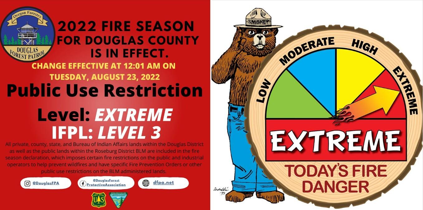 DFPA has announced an increase in the fire danger up to extreme, starting today, Tuesday August 23rd. Here is the full announcement from DFPA: "EFFECTIVE TODAY, TUESDAY, AUGUST 23, 2022. FIRE DANGER LEVEL: EXTREME Public Use Restrictions are in place. IFPL: LEVEL 3 Industrial Fire Protection Restrictions are in place. Please visit www.dfpa.net or give us a call at the office to learn more about the regulations. Questions, concerns or comments? Send us a direct message, give us a call, or visit the website." Via DFPA
