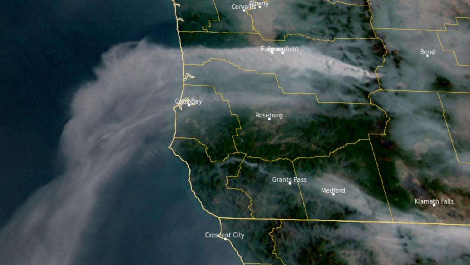 Looking at the smoke forecast again and the latest satellite imagery this morning and we could end up getting pretty fortunate in Roseburg smoke-wise today. Smoke from the Cedar Creek Fire is blowing straight west and only moving south closer to the coast, keeping us kind of in the clear. Not saying things couldn't change, but I'm more optimistic about our smoke conditions this morning.