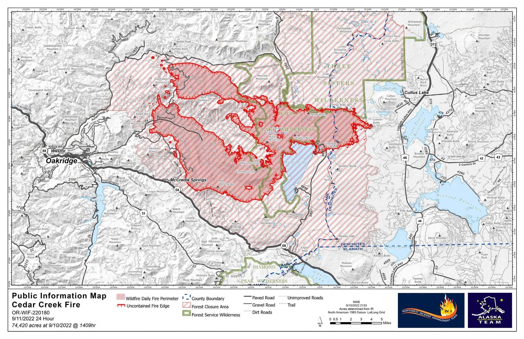 Officials on the Cedar Creek Fire dropped containment levels to 0% today as the fire breached existing lines and has grown to over 85k acres as of Sunday morning. Here is the latest information on the Cedar Creek Fire from incident command: Size: 85,926 acres Contained: 0% Start Date: August 1, 2022 Location: 15 miles E of Oakridge, OR Cause: Lightning Total personnel: 994 Resources: 53 engines, 19 crews, 62 heavy equipment, 8 helicopters Current Situation: A Level 3 evacuation remains in place for the greater Oakridge, Westfir, and High Prairie area. There have been no changes in evacuation levels or areas in the last day. The fire grew significantly due to the weekend’s weather event (over 32,000 acres), primarily to the west, driven by strong easterly winds and dry fuels. Because the fire breached existing lines, the fire’s containment has been dropped to 0%. Currently 2,230 homes and 443 commercial structures remain under threat from the Cedar Creek Fire. The Office of the Oregon State Fire Marshal has committed seven taskforces and an incident management team to protect homes, businesses, and critical infrastructure in the area. Due to strong east winds and triple digit temperatures that work has primarily focused on the west side of the fire. As conditions change and winds shift, firefighters with the Oregon State Fire Marshal’s office will continue to evaluate threats to lives and properties. Fire crews will continue working day and night shifts to access structures and patrol critical areas where the fire is encroaching. Status: Yesterday evening, as winds started moving toward the east, firefighters on the western flank completed strategic burning operations near Eagle Butte, 5 miles northeast of Oakridge. The fire remained north of Highway 58, south of Forest Road 19, and east of Eagle Butte. Today, resources will maintain a heavy presence on the Highway 58 and Forest Road 19 corridors as they continue direct attack on the fire. Crews on the western flanks will mop-up and secure burnout operations. In the east zone, direct checking actions continued on the southeast edge of the fire in the Waldo Lake area. Efforts are focused on creating fire breaks along existing roads and other barriers and burn-out operations to reduce fuels. Heavy equipment is arriving on site for use near Cultus Lake and Little Cultus Lake, and along the Cascade Lakes Highway and forest roads. The Cascade Lakes Highway remains closed to protect the public and firefighters as crews remove brush. Crews are preparing Forest Road 4290 between Charlton Lakes and the Cascade Lakes Highway to control the spread of the fire to the southeast. Brushing along the Cascade Lakes Highway continues to create fuel breaks 100-200 feet in depth on both sides of the road. Crews are working in the Brown Mountain area to reinforce a barrier east of the highway between Crane Prairie and Wickiup reservoirs. These fire breaks are high priority and will likely take most of a week to complete. In addition, crews are prepping infrastructure around Lava Lake Resort and evaluating values around Odell Lake. Weather/Fire Behavior: The extreme weather from the last two days has eased. Winds are shifting to northwesterly direction and have calmed. It is still very dry, but temperatures are starting to cool, and the heavy smoke layer has the effect of shading and moderating fire activity. Spotting and torching are still anticipated, and fire will continue to advance through lichens and heavy fuels.