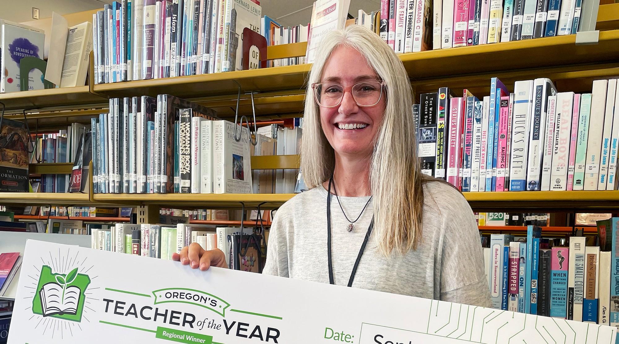 The Oregon Department of Education, in partnership with the Oregon Lottery, is pleased to announce the Oregon Regional Teacher of the Year awards to honor exemplary educators in every region of the state. Candidates are exceptionally dedicated, knowledgeable and skilled licensed public-school educators in grades PreK – 12. With passion, commitment and innovation at the heart of their work even through extraordinary circumstances, 16 teachers have been selected from across the state of Oregon as 2023 Regional Teachers of the Year. Roseburg High School social studies teacher, Gwen Bartlett has been named Douglas ESD’s 2023 Regional Teacher of the Year! On Sept. 12th, Bartlett was presented with the award and a $1,000 cash prize at a celebratory school staff meeting. “I have not walked this path alone, nor the only educator worthy of recognition, say Gwen Bartlett, Roseburg High School teacher. “I represent numerous educators who give unconditionally to their students every day. I am grateful to my colleagues at Roseburg High School who have supported, collaborated and shaped me as a professional over the years.” Regional Teachers of the Year are nominated by students, colleagues, administrators, friends or family members to apply for the award, and are selected by a diverse panel of regional representatives. Later this fall, one of the Regional Teachers of the Year will be named the 2023 Oregon Teacher of the Year. “Mrs. Bartlett’s ability to ensure every student has a place and feels important while providing a learning experience that they will never forget is what we want for each and every student,” says Roseburg High School Principal, Dr. Jill Weber. “She has inspired countless students and changed numerous lives through her engaging instruction, caring heart for all students, and her understanding of the students she teaches. In addition, she is an outstanding leader, where she leads and mentors other teachers, both new and seasoned. She is also very involved with student activities through advising numerous clubs and is the high school’s head track coach.” Thanks to the Oregon Department of Education’s partnership with the Oregon Lottery, the 2023 Oregon Teacher of the Year receives a $10,000 cash prize, $5,000 is also awarded to their school, and they serve as a spokesperson and representative for all Oregon teachers. Three finalists will receive $2,000 with a matching $2,000 going to their school. Please visit OregonTeacheroftheYear.org for more information or to nominate a deserving teacher for 2024. “Excellent educators have always been the most important resources to ensure students’ success, and they stepped up in new ways throughout these last few singular years.” – CCSSO National Teacher of the Year Program. Via ESD