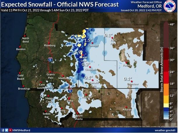 The first snow of the year up in the Diamond Lake/Crater Lake should happen Saturday night into Sunday. Snow levels are expected to drop down to 4000 feet.