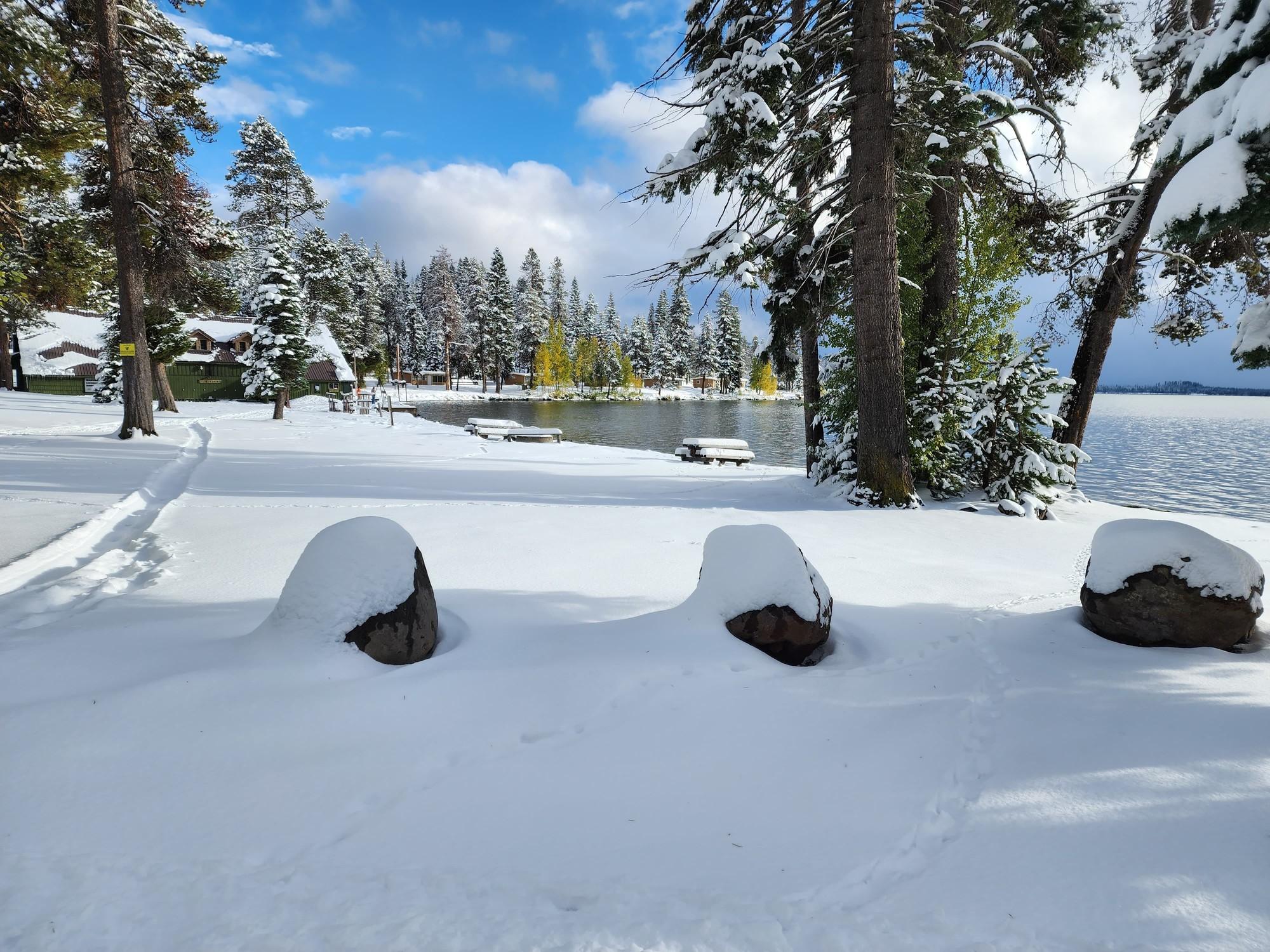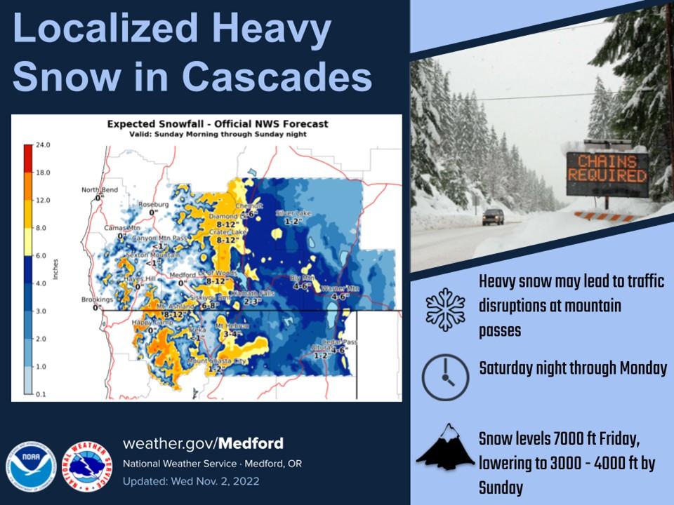 The Diamond Lake area currently has about 8 inches of snow on the ground. Snow levels will drop from 7000 feet to as low as 2500 feet behind a front expected to arrive Saturday. This will bring moderate to localized heavy snow, mainly in the Cascades and Western Siskiyou County, and could lead to disruption of traffic at mountain passes. This graphic shows an image of heavy snow in the mountains with snow totals up to a foot in the Cascades. Up at Crater Lake, the park has closed Rim Drive, North Entrance and Pinnacles Roads for the winter season. Here is the latest forecast discussion from the NWS. Tonight November 2 through Friday night November 4... The most immediate change was to extend the Winter Weather Advisory /PDXWSWMFR/ for the southern Oregon Cascades and Siskiyous through 8 PM PDT this evening. Showers and snow showers will linger this evening, particularly early this evening along and near northwest facing slopes such as the Cascades and the Umpqua Divide with up to 2 inches of new snow. Light snow showers are also expected for much of south central Oregon and northern California with up to an inch of new accumulation. The snow level is around 2500 to 3000 ft msl and will drop as low as 2000 feet by the time that activity tapers off at the end of the evening. Thursday will be the closest thing to a true break in the active, wet pattern with shortwave ridging into our area, associated with a broader area of high pressure centered far offshore from California. With a stabilizing air mass and lingering low level moisture, valley stratus and patchy freezing fog is expected late tonight into Thursday morning. This will be mainly in west side valleys, and in the Klamath Basin. It will be colder Thursday morning with west side lows in the lower 20s to mid 30s, and east side lows in the single digits to lower teens. Lows will be around 5 to 15 degrees below normal, and within about 10 degrees of records on the east side. By the end of Thursday afternoon, there is a slight chance of rain at the coast from Port Orford northward and inland to around Elkton from a warm front pushing into the Pacific Northwest. This front will focus its energy into Washington and northern Oregon, with the highest probability of rain in our area for Coos and Douglas counties, secondarily for Curry County Thursday night through Friday. Rainfall amounts in those areas will be mainly up to a tenth of an inch, with very light amounts possible elsewhere. Snow levels will rise from around 4000 feet Thursday evening to 7500 feet by the start of Friday evening. There is a growing consensus in the ensemble data for a strong cold front to push southeast into our area beginning Friday night, initially affecting the coast and Douglas County during Friday evening. Moderate to heavy precipitation and strengthening winds are expected later Friday night with snow levels remaining quite high, above 6500 feet msl. During Friday night, the most intense precipitation is expected in western and central Oregon. This includes southwest Oregon and northern Klamath County beginning after midnight. -DW Photos courtesy of Ginger Finch