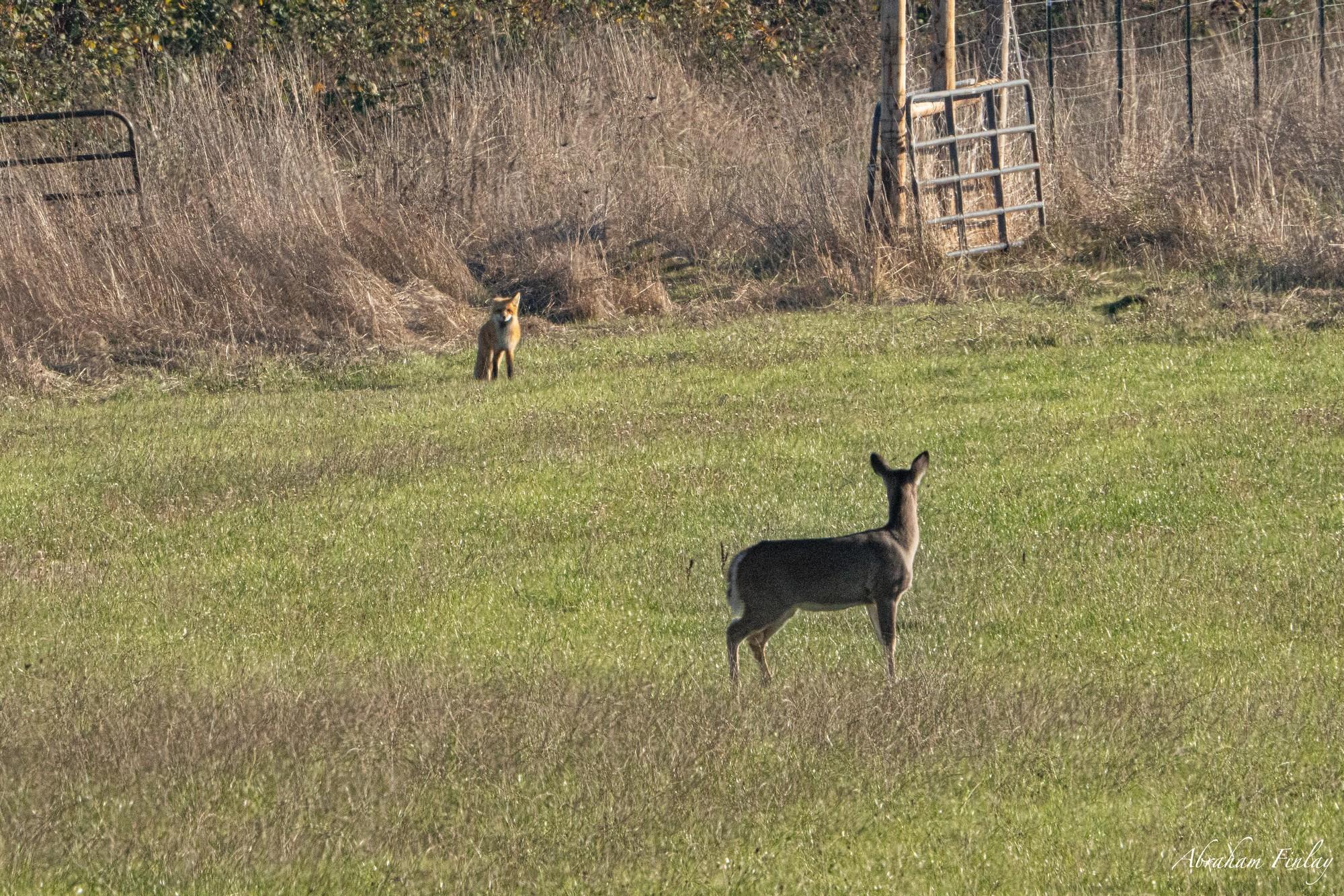 While out driving with my dad earlier this afternoon we came across a Fox and a doe having a stare-down!
