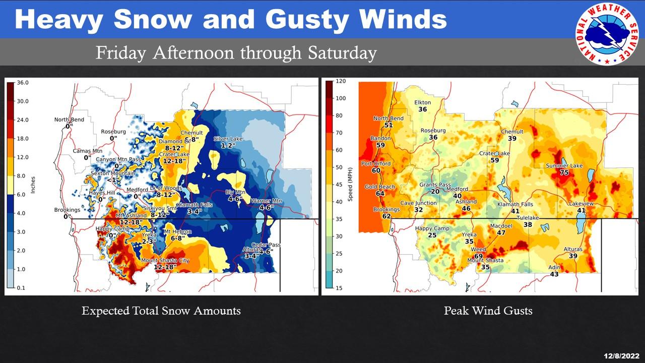 The latest weather forecasts are showing high winds arriving in Douglas County on Friday afternoon with gusts reaching as high as 36 mph according to the NWS in Medford. Here is the full forecast discussion from the NWS in Medford: The latest satellite image is showing the next storm already starting to take shape over the eastern Pacific. Three main impacts are likely from this storm: Strong winds, moderate to heavy snow, and heavy rain. Each of these impacts will be addressed below. WINDS- Winds will ramp up along the coast during the day as a strong warm front approaches the coast. Strong winds are likely over the exposed areas along the coast, mainly around and south of Cape Blanco. Guidance shows pressure gradients between Arcata and North Bend are around 10 mb which almost always results in high wind along the coast. A High Wind Warning remains in effect for exposed areas above 1500 feet primarily from Cape Blanco south. Moderate to strong winds are also expected in the Shasta Valley, with the strongest winds near Weed. Meanwhile we could experience gusty southeast winds in the Rogue Valley, especially from about Phoenix south to Ashland, although Medford could also experience gusty southeast winds late Friday morning into Friday evening. Moderate to strong winds are also likely east of the Cascades with 700mb winds between 60-70 kts moving over the Cascades later tonight, and peaking out between 75-80 kts Saturday morning. High Wind Warnings and Wind Advisories remain in effect for the areas noted above. Please see NPWMFR for more details. Note: We currently have a wind advisory for only the eastern half of Lake County. However, we are also expecting snow at the same time that strong winds are occurring and the details on the winds will be addressed in the winter weather products. Winds along the coast, Shasta Valley and south end of the Rogue Valley will diminish late tonight into Saturday morning. Winds will remain moderate to strong east of the Cascades into Saturday morning, then they are expected to gradually diminish Saturday afternoon from northeast to southeast. Therefore places like Modoc County could experience moderate to strong winds into Saturday afternoon. Winds should no longer be a concern for all areas Saturday night as the upper trough moves into the area. SNOW- Snow will also be a concern, especially along the Cascades into Siskiyou county and northwest Modoc County. These areas will get moderate to heavy snow from this evening through at least Saturday afternoon and there's a good chance for snow fall rates to exceed an inch per hour at times. Note: The Mount Shasta area (which includes I-5 south of Weed to Dunsmuir) and highway 89 are at highest risk of experiencing heavy snow with snowfall rates between 1-2 inches an hour tonight into Saturday morning. Highway 97 towards Weed is also at risk for moderate to heavy snow with snowfall rates pushing to an inch per hour tonight into Saturday morning. It's also worth noting visibilities in these areas could also be reduced at times to a 1/2 mile or less. Moderate to heavy snow is also likely along the Cascades and Siskiyous along with strong winds, especially over the exposed areas, and its' not out of the question snowfall rates could exceed an inch per hour along the Mt. Ashland Ski road, highways 230 and 138 near Diamond Lake and highway 62 towards Crater Lake. Highway 97 will also be impacted by a combination of moderate to heavy snow and moderate to strong winds. Storm total snow further east of the Cascades (east of highway 97) will be less, but significant impacts are still expected mainly due to visibilities being reduced to a 1/2 mile or less and could result in brief whiteout conditions tonight into Saturday morning. Siskiyou Summit will also get significant snow tonight into Saturday morning with up to a 12 inches possible between this evening through Saturday afternoon. Because of the above mentioned, this is likely to cause hazardous travel conditions. Therefore it's highly recommended that folks stay home and avoid traveling, especially from late this afternoon through Saturday morning for the areas noted above. Winter storm Warning and Winter Weather Advisories are in effect for the areas noted above. Please see WSWMFR for more details. RAIN- The heaviest precipitation is expected to arrive late this afternoon along the coast and tonight inland. Because were expecting gusty winds in the Rogue and Shasta Valleys Friday, these areas will experience downsloping which could result in dry weather Friday afternoon, with precipitation amounts limited Friday evening as the front gets closer to these areas. It will be a different story for the coast, coastal mountains, Cascades and Siskiyou County. 24 hour storm total precipitation is expected to be between 4 and 5 inches for the coastal mountains in southwest Oregon, and south coast, 1.5 to 2.0 inches for the north coast, 2 to 3 inches along the Cascades and 3.50 to 4.50 inches from western through southern Siskiyou County. Because of the expected high rainfall totals over the coastal mountains and south coast, mud and rockslides could be a concern, especially along highway 101. Winds and precipitation will will diminish late Saturday afternoon into Saturday night as the upper trough approaches southeast Oregon. However a colder air mass will move overhead with snow levels lowering to around 2000 feet west of the Cascades. We aren't expecting much, if any snow accumulation that low over the west side, but there can still be a few to several inches of snow over the mountains. The cold air mass could result in enough instability for isolated thunderstorms over the waters and possibly the south coast Saturday afternoon and evening.