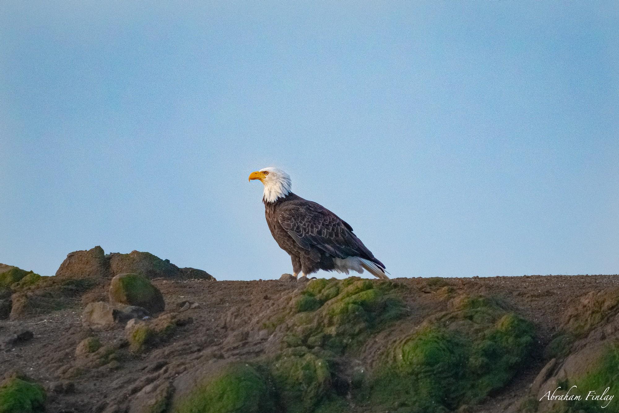 On a recent trip to the coast I watched this Bald Eagle land on this big rock that sticks out into the ocean a little while after sunrise. After I watched it for a little bit it took off and started hunting.