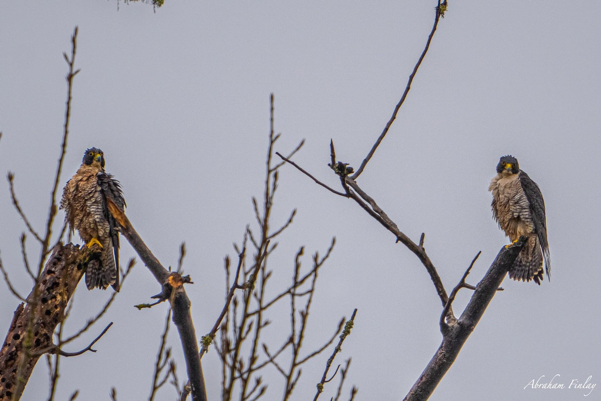 Peregrine Falcons hunt an enormous variety of birds. There have been 450 North American bird species documented as prey for them! They have been documented killing birds as large as Sandhill Crane, and as small as a hummingbird! Peregrines often start off hunting from a high vantage point until they spot prey and then dive at great speed to catch their prey. They can dive at speeds of up to 238 mph! The name "peregrine" means wanderer. Peregrine Falcons have one of the longest migrations of any North American bird! Some Peregrines may move 25,000 km (15,500 mi) in a year! Peregrine Falcons typically nest on cliffs, cliffs they nest on can vary from 25-1,300 feet. At the beginning of each nesting season, the male picks out several possible nesting locations for the female to choose from. They don't build their nests out of sticks, grass, and other materials like a lot of other raptors, instead, once the nesting location is chosen they scrape out a depression in the sand, gravel, or other substrates of the nest site. In areas without cliffs, they will use abandoned nests of other large birds. It is believed that due to DDT poisoning, from 1950-1970 populations crashed. Since 1966 populations appear to have stabilized. Rodents and small birds would ingest from eating seeds and other food contaminated with DDT and then Peregrine Falcons would prey on them. The DDT caused them to lay eggs with thin shells which then would break under the weight of the parents during incubation. DDT was banned in 1972. During migration, they can be found in almost any open habitat flying or perched. A couple of good places to look for them near Roseburg include Fords Pond sometimes and Plat I Reservoir near Sutherlin. The Peregrine Falcons in the photo I took below were perched along the South Umpqua River in Roseburg.