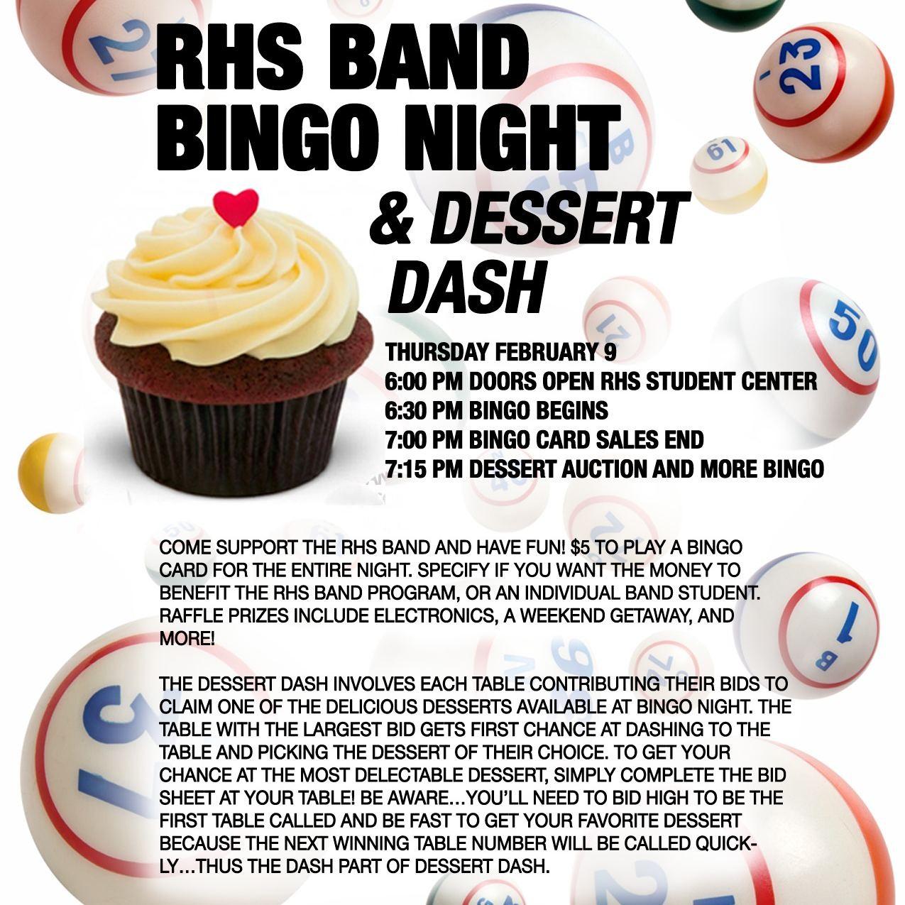 The Roseburg High School Band is hosting a bingo night fundraiser this Thursday night, February 9th at the RHS Student Center at 6pm. Here are the details: Band Bingo RHS Student Center Thursday, February 9 6:00 / Doors open for sales and seating 6:30 / Bingo begins around $5 per card Raffle Prizes will be available. Tickets are $1 each or 6 for $5 Also, have one dollar bills ready for our exciting final game: 50/50 Blackout! "Dessert Dash!": There will be a desserts available for auction Dinner will not be served at the event this year Via Roseburg High School