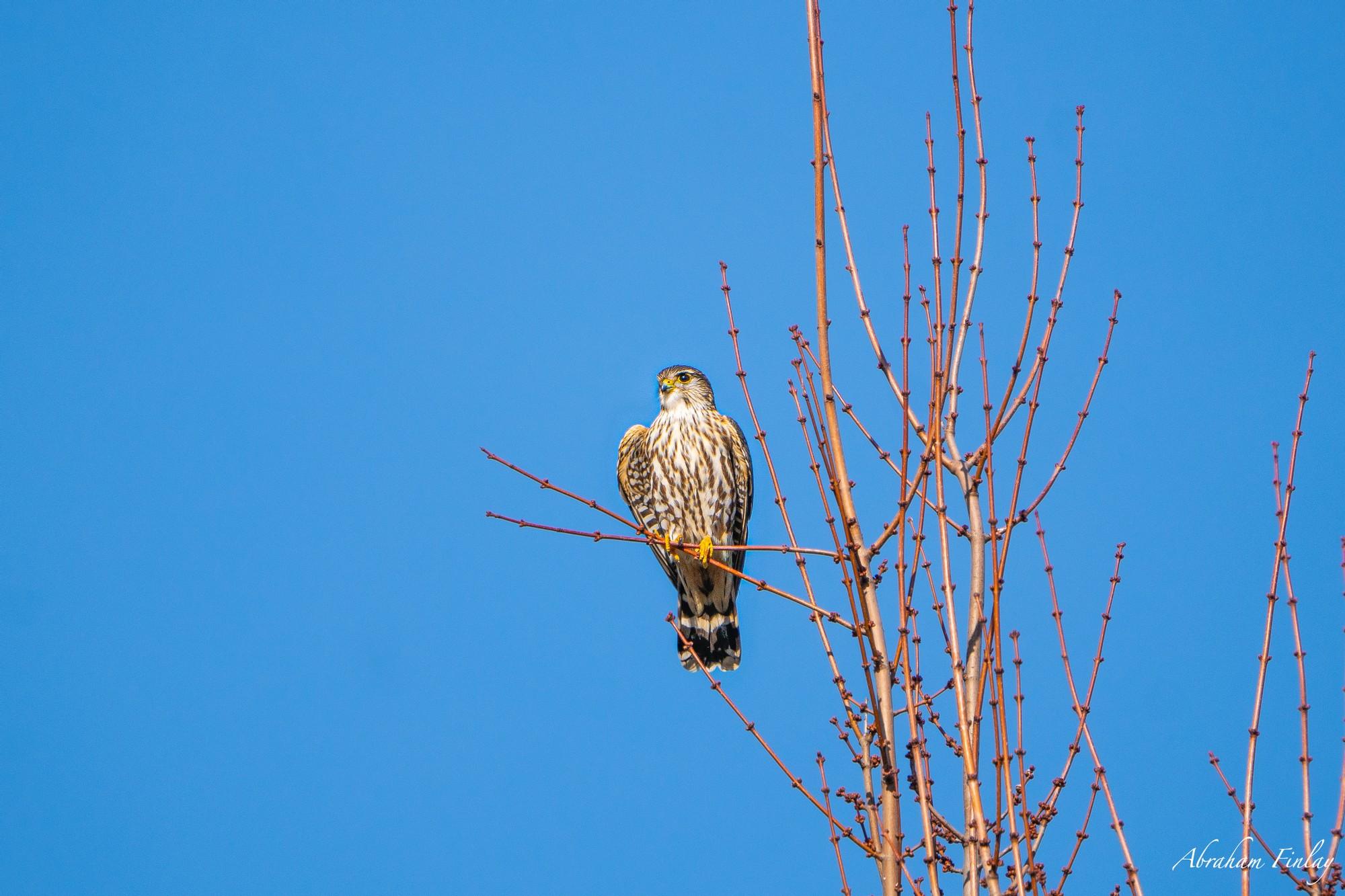 A few days ago I was outside my house watching this Merlin (A smaller relative of the Peregrine Falcon) circling high above when suddenly it dove into a neighbors backyard chasing after a flock of small birds before landing in a tall tree!
