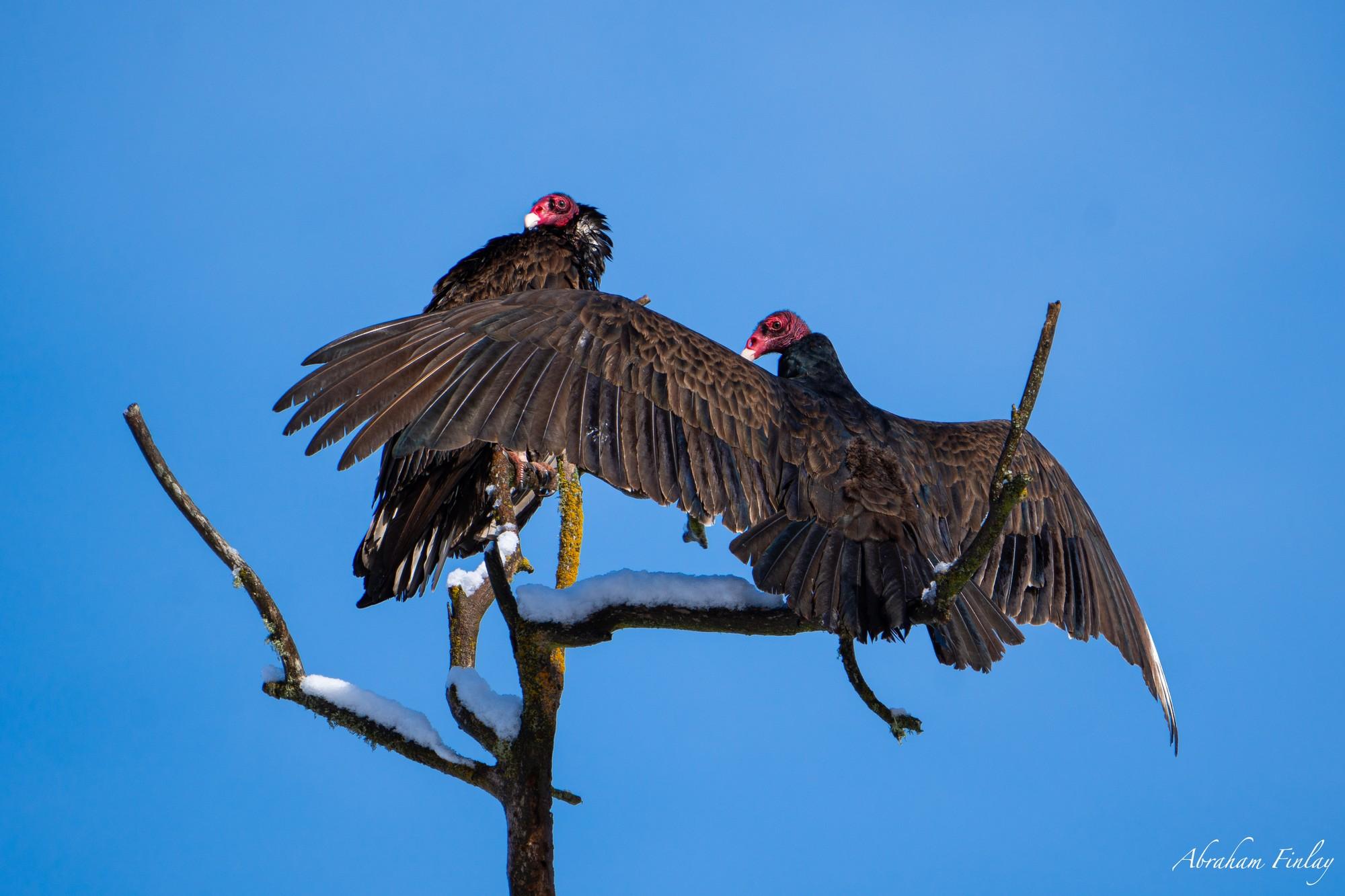 I was outside this morning shoveling our driveway of snow and I watched these two Turkey Vultures land in a tree and start sunning themselves. They recently arrived here after migrating back from as far away as Central America and probably didn’t expect to encounter snowfall!