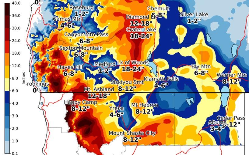 Another round of snow will impact the region through Tuesday. Snow levels 1500 to 1800 feet will lower to 500 feet Monday night. Heavy snow will impact area passes and mountains from the Cascades west and the Illinois Valley and lower Klamath River Valley. Moderate to locally heavy snow will also impact many western valleys and areas east of the Cascades. Snow covered roads will cause hazardous road conditions. If you have to travel, be sure to carry an emergency kit, chains and check road conditions before you go. Here's the latest forecast discussion with the NWS in Medford. https://www.weather.gov/wrh/TextProduct?product=afdmfr Via NWS in Medford
