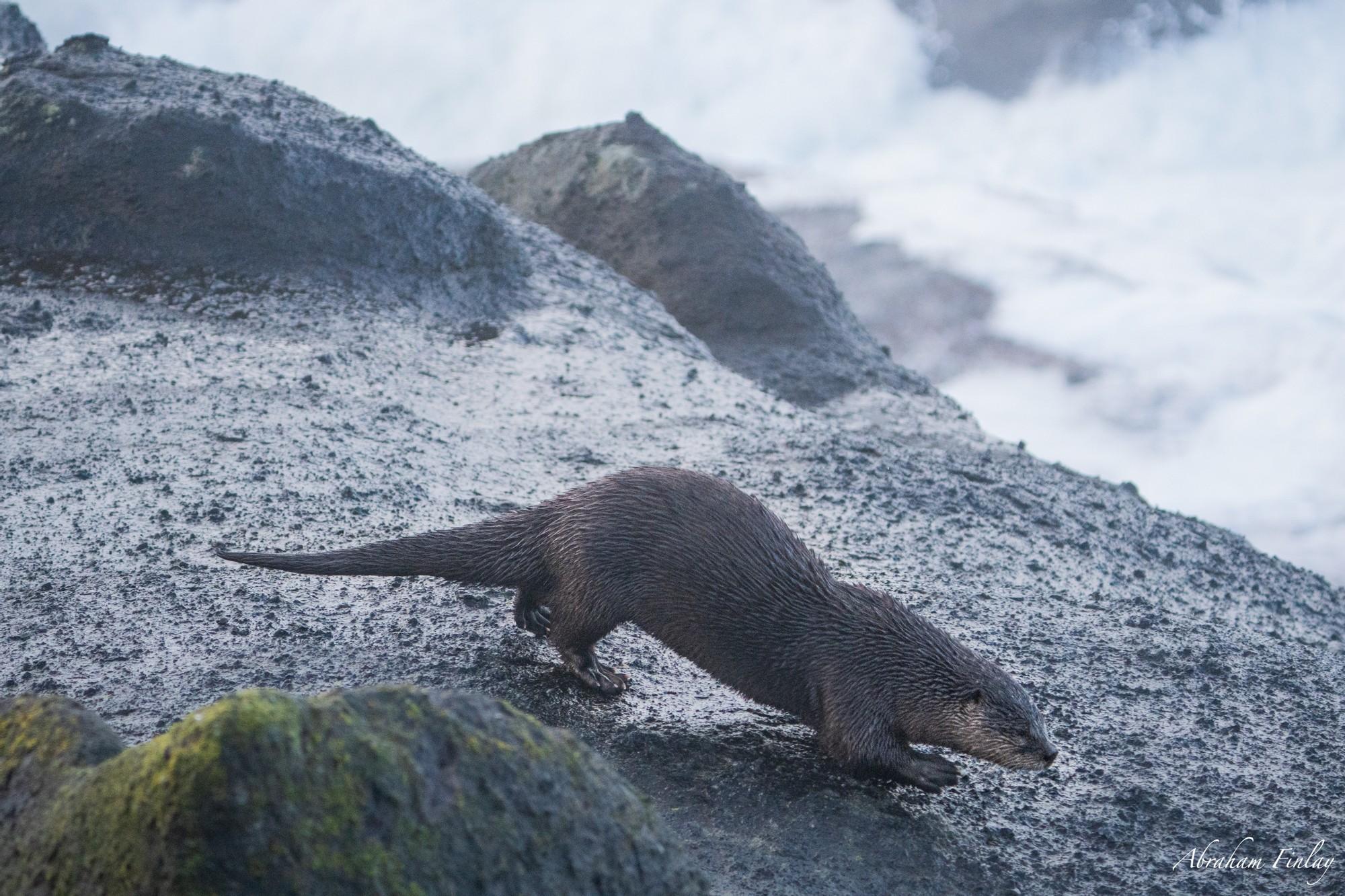 During our recent trip to Depoe Bay, I was looking out the window of the place we were staying when I spotted a large flock of seagulls circling over a section of rocky cliff overlooking the ocean. I went outside to get a better look and after a minute spotted what was causing the commotion. A River Otter was running along the rocks towards me heading for a small creek that runs into the ocean. I was able to capture a photo of this rare event!