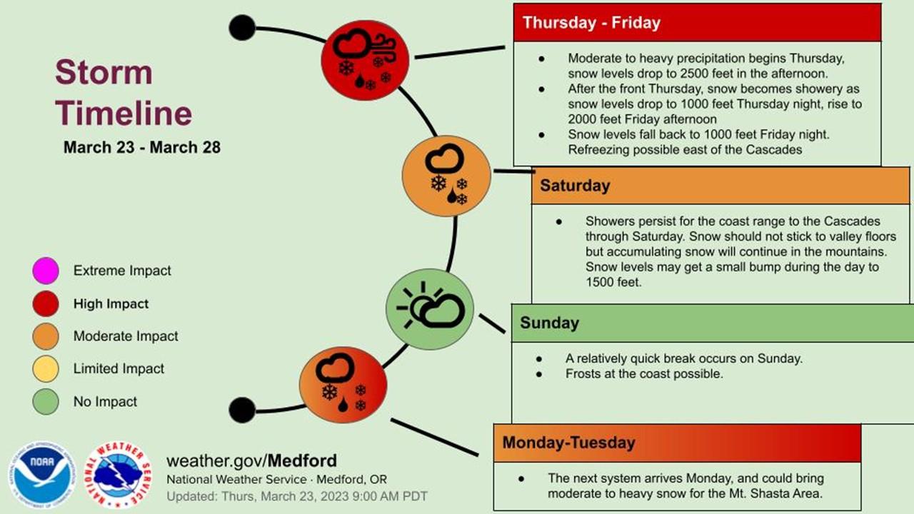 A winter storm will impact our region Thursday morning into Friday afternoon. Snow levels are expected to range from 3000 to 3500 feet Thursday, falling to around 1000 feet Thursday night then rising to around 2000 feet Friday afternoon. The heaviest snow will fall in the Coastal Mountains, western Siskiyou County, eastern Douglas County, and especially the southern Oregon Cascades. West winds at 15 to 25 mph with gusts of 25 to 40 mph will accompany the snow. If you have travel plans this weekend, be prepared for wintry conditions. There is a small chance of snow at the valley floors at times on Friday and early Saturday morning. Here's the latest forecast discussion from the NWS in Medford - Issued 4:45 AM PDT Thu Mar 23 2023 SHORT TERM: Today through Friday. A Winter Storm Warning and Winter Weather Advisory remains in effect later today into Friday for most of the west side above 1500 feet, and the higher terrain of northern and eastern Klamath County and western Lake County. Precipitation is currently limited to light scattered snow showers over the southern Oregon Cascades. That will change in a few hours as a cold front brings rain to the coast. The front will track across the area with rain and snow today. Precipitation is expected to reach the Cascades by noon then develop across the east side into this evening. The most intense rates of precipitation will occur with the frontal passage. Snow levels will begin around 3000 to 3500 feet, then fall to around 1000 feet tonight behind the front with precipitation transitioning to showers. Westerly low level flow tonight through Friday will bring the highest amounts to upslope portions of the higher terrain of southwest Oregon. This includes eastern Curry, western Josephine, eastern Douglas, and eastern Jackson County. Totals of 12 to 24 inches are expected in the southern Oregon Cascades, 6 to 12 inches in the Kalmiopsis Wilderness, Siskiyou Mountains, and northern California Cascades, and 3 to 6 inches for the higher terrain of the east side (including Highway 97 north of Chiloquin). LONG TERM: Friday night through Wednesday. A pretty impressive winter weather pattern persists across the region. We're expecting cold northwest flow to persist behind the cold front from Friday night into Saturday. 850 mb temperatures will likely be around -5 to -6 C. Air this cold is usually supportive of snow in the valleys west of the Cascades during the winter. We do have snow in the forecast for the valley floors Friday night into Saturday morning. This will mostly be dependent if a showers can hold together as the move off the mountains into the valleys. Nonetheless, don't be surprised to see snow on the grass Saturday morning. By Saturday, the axis of the low enters southern Oregon. This will promote an unstable atmosphere and pockets of convective available potential energy (CAPE). With a more showery pattern, temperatures in some of the valleys will warm up into the mid 40's. Lapse rates are up to 8C/km up to 650 mb, which is rather unstable. All these things considered, one should expect plenty of shower activity with the low chance of a rumble of thunder across the region. With regards to snow accumulating from Thursday up until Saturday afternoon, we're looking at up to 2 feet of snow over the Cascades. This seems reasonable given the persistent westerly flow that favors the west to east sloping Cascades from Thursday even into Saturday. The coastal range will also be under focus here as these convective showery patterns produce a lot of snow in the Kalmiopsis wilderness. By Saturday night into Sunday, high pressure begins to build over the forecast area as the upper level low departs. Models still have a 30 to 50 percent chance of rain along the coast and the higher Cascades with drier conditions farther to the east. There are some models disagreements with how Sunday pans out. The NBM currently shows those PoP chances spreading eastwards into the day Sunday, which goes against what some of the deterministic models show right now. This is probably due to how the models are handling the next system. Right now, it's looking like Monday into Tuesday is the best time for weather impacts with this low. The snow percentiles show 18 inches in the 75th percentile for Mt. Shasta City. Consequently, there is also 3 inches in the 25th percentile for that same area. That rather large spread suggests that the track of this low For latest road conditions by ODOT- https://tripcheck.com/