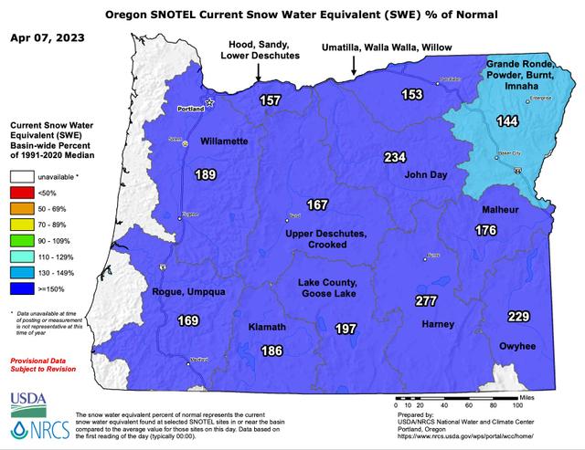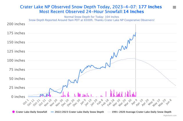 Crater Lake has received an additional 14 inches of snow in the last 24 hours, raising the total snowpack at the National Park to 177 inches. This is 73 inches above the typical amount for this time of year. The road from Park Headquarters to Rim Village remains closed due to large amounts of snow and there is no estimate for reopening at this time, according to the NPS. As a result, the Snow Water Equivalent (SWE) for the Umpqua District now stands at 169% of the average. Around this time in 2022, the SWE was slightly above 50%. Diamond and Crater Lake are expected to receive another 2-4 inches of snow today before conditions begin to dry out starting Friday night and lasting through the weekend. Temperatures are also set to rise over the weekend before falling once more early next week, coinciding with the arrival of several days of additional moisture. However, starting next Wednesday, the weather appears to be turning drier and warmer, transitioning to more spring-like conditions.