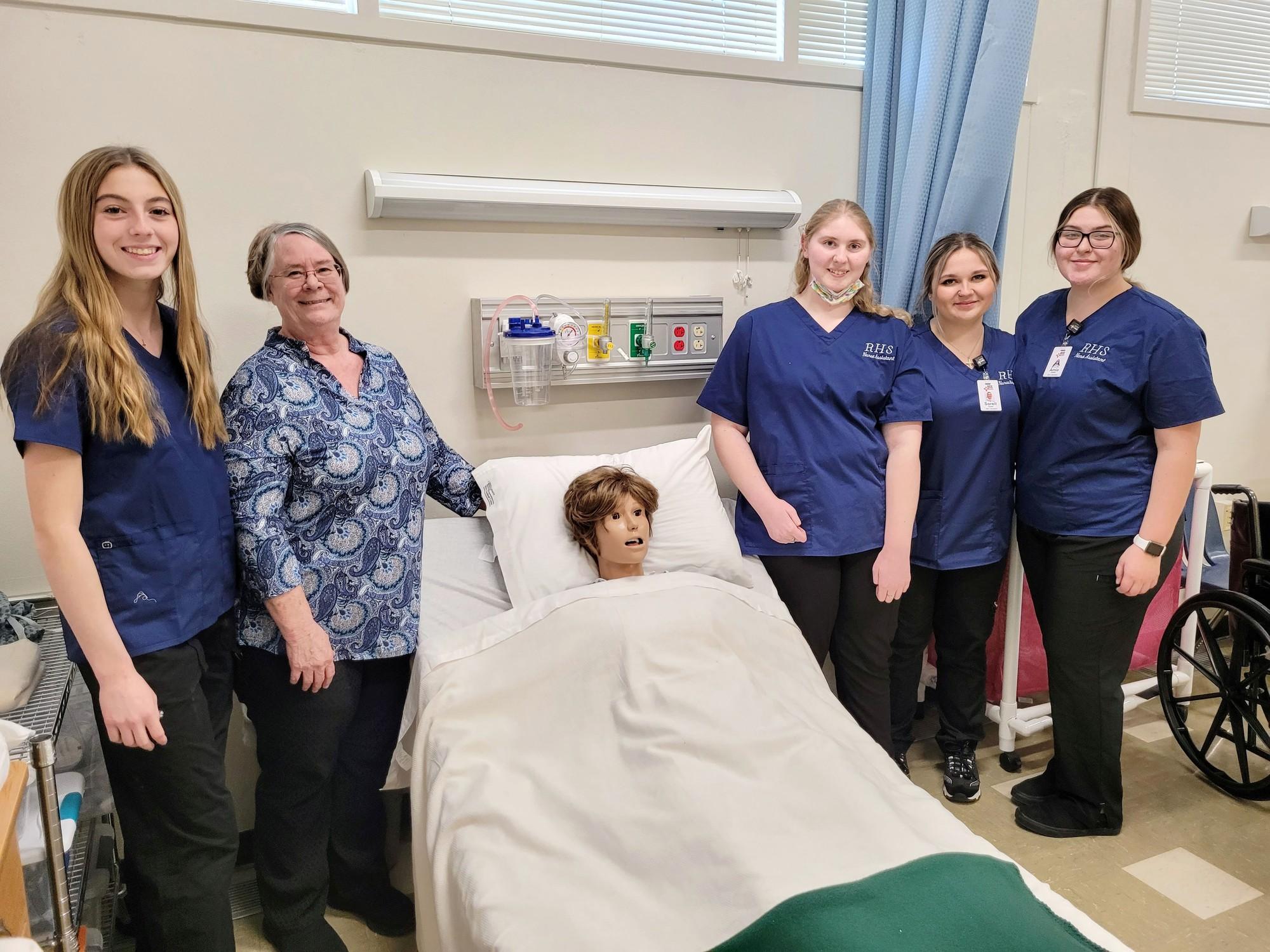 Taking blood pressure, assisted feeding in bed, ambulation with a gait belt, transfers from beds in and out of wheelchairs are only a few of the hands-on experiences students gain in the Roseburg High School Nursing Assistant Level One Program. RHS offers juniors and seniors the chance to participate in the dual enrollment program with Umpqua Community College. The program is the only one like it in Douglas County and one of only a handful in Oregon. “I would definitely recommend this class to anyone looking to join the medical field,” said senior Sorrell Carter. “It’s a huge step up because we’re in high school and it’s a great opportunity to get ahead. We have a wonderful teacher who makes learning fun and interactive.” “I think it’s fun to learn and get a better understanding. When we go to clinicals, it allows us to see if we want to pursue this career choice,” added junior Addison Scalf. Roseburg High School students who enroll in the program have the opportunity to earn nine college credits that will walk students straight into Umpqua Community College’s Nursing Program. This valuable resource makes it easier for students to transition into a nursing career. As a bonus, they can gain work experience right out of high school as a certified nursing assistant. Students in the program participate in classroom and skill lab instruction at the high school during school hours. In addition, students gain hands-on clinical experiences during work nights and weekends in off-campus care facilities. The Oregon State Board of Nursing-approved course involves 164-plus hours of training in basic bedside nursing skills, basic restorative skills, mental health and social service needs, personal care skills, and knowledge of clients’ rights. Participants gain the knowledge and skills necessary to care for clients in long-term care and acute care facilities that are under direct care of a licensed nurse. The partnership also extends to CHI Mercy Health, where students have opportunities to complete practicums. “So far I have a 100% employment rate, all of my students have jobs by the time they are finished and have gone on to the Nursing Program,” instructor Jan Dawson said. “I love watching their personal growth through this class, the change from week 1 to week 7. From the beginning to the point we’re going to clinicals is dramatic. They learn teamwork. They work together, the camaraderie is outstanding. I think the growth they get in this class is tremendous.” Via Roseburg School District