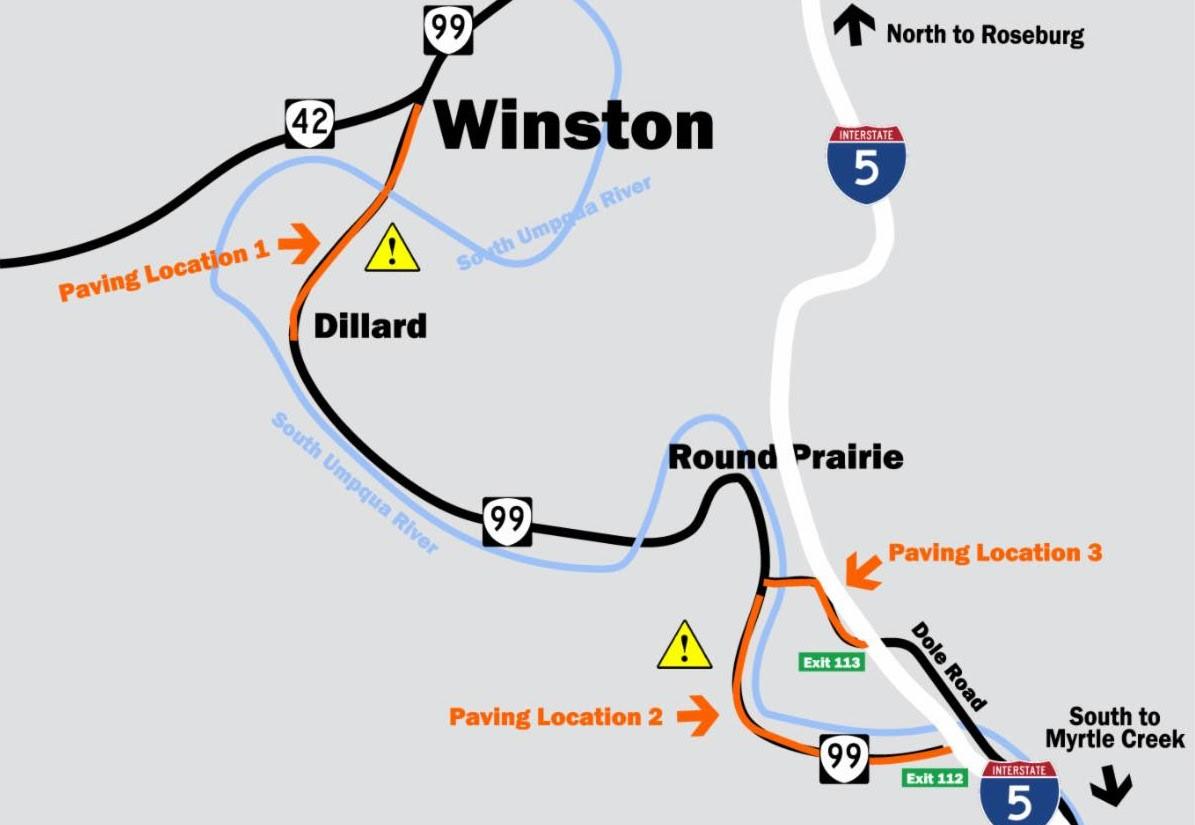 The Douglas County Public Works Department (DCPW), in collaboration with the County Commissioners, the City of Winston, and the Oregon Department of Transportation, have announced the start of a major paving and striping project in south-central Douglas County. This project will take place along Hwy 99 South (County Road #387) near Winston and Dillard, as well as on Dole Road (County Road #14). Scheduled to begin on May 8, 2023, and continuing through the end of June 2023, the project will entail asphalt paving, striping, and localized pavement removal and replacement at three separate locations. Project Location #1: Hwy 99 South (County Road #387) from Winston to Dillard Location: Begins at the intersection of Hwy 99 South (County Road #387) and OR 42 and goes approximately two miles south to the community of Dillard. This location will require the closure of a small section of the road for one week in May.* The remainder of the project will include intermittent lane closures, brief delays, minimal night paving, and traffic control by flagging crews. Project Location #2: Hwy 99 South (County Road #387) near I-5 Exit 112 Location: Begins at the intersection of Hwy 99 South (County Road #387) and Dole Road and goes approximately two miles south to I-5 southbound Exit 112. This location will include intermittent lane closures, brief delays, minimal night paving, and traffic control by flagging crews. Project Location #3: Dole Road (County Road #14) near I-5 Exit 113 Location: Begins at the intersection of Hwy 99 South (County Road #387) and Dole Road (County Road #14) goes approximately 1/5th of a mile south to I-5 southbound Exit 113. This location will include intermittent lane closures, brief delays, minimal night paving, and traffic control by flagging crews. *Beginning May 8, 2023, a 220 foot section of the northbound lanes and left turn lane at the traffic light at the intersection of Hwy 99 South and Hwy 42 in Winston will be closed for one week while crews work to remove and replace several layers of concrete and asphalt. DCPW will provide reader boards with advance warning notices, as well as barricades and warning signs with traffic delineation to notify the motoring public of the week long closure. Motorists traveling on adjacent roads are also asked to watch out for construction signs/warnings, intermittent lane closures, construction vehicles, construction workers and flagging crews. Motorists, bicyclists and pedestrians will be asked to find alternative routes through the closed section during this time. Travel on this section of the road will be closed from Monday, May 8 -12, 2023. The southbound lanes of Hwy 99 South and Hwy 42 will not be affected by the closure. For the duration of the project, motorists are asked to watch out for intermittent lane closures, expect brief delays due and follow traffic control safety measures provided by flaggers. Douglas County Public Works will manage the paving and striping project, in partnership with contractor Knife River of Roseburg, Oregon. The project was designed by i.e. Engineering. The total estimated cost of the paving and striping project is $3.5 million, and comes from county category funding. Safety is always a priority for the motoring public, as well as for our employees. Please understand that road construction projects will impact drive times, so we are asking residents to plan accordingly. Motorists in this area can expect up to 20-minute delays, and are asked to seek alternate routes whenever possible. If you plan to travel in this area or near any road construction zone, please proceed with caution, be patient and obey all posted signs, warnings and flagger safety instructions. For more information, please contact DCPW at (541) 440-4481 or log onto https://douglascounty-oregon.us/. Via Douglas County Release