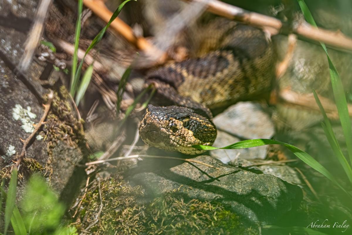 While up hiking in the mountains today, we came across a Western Rattlesnake den! We hung out in the area until the sun came out and I was able to get these photos of a big rattlesnake at the entrance of the den!