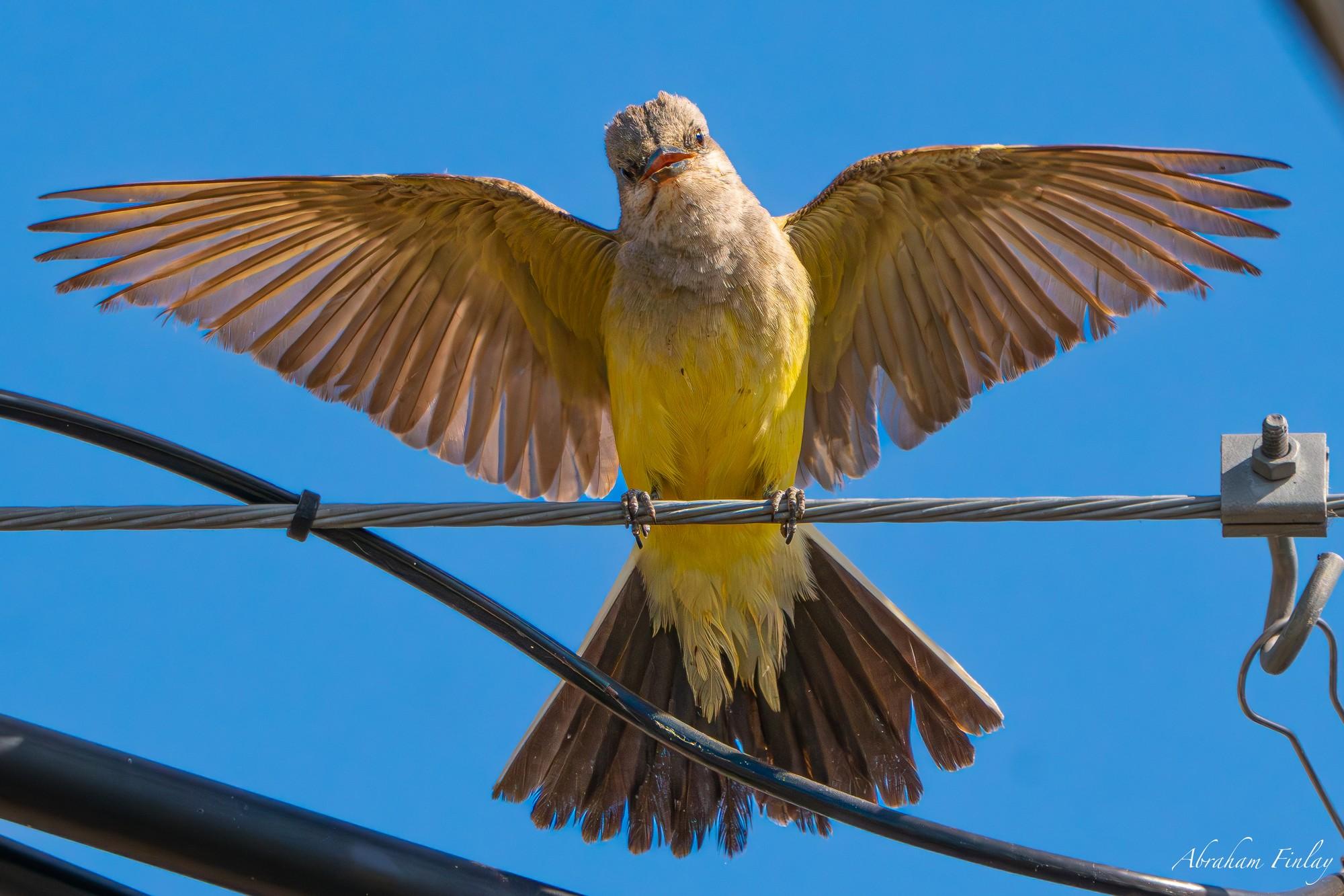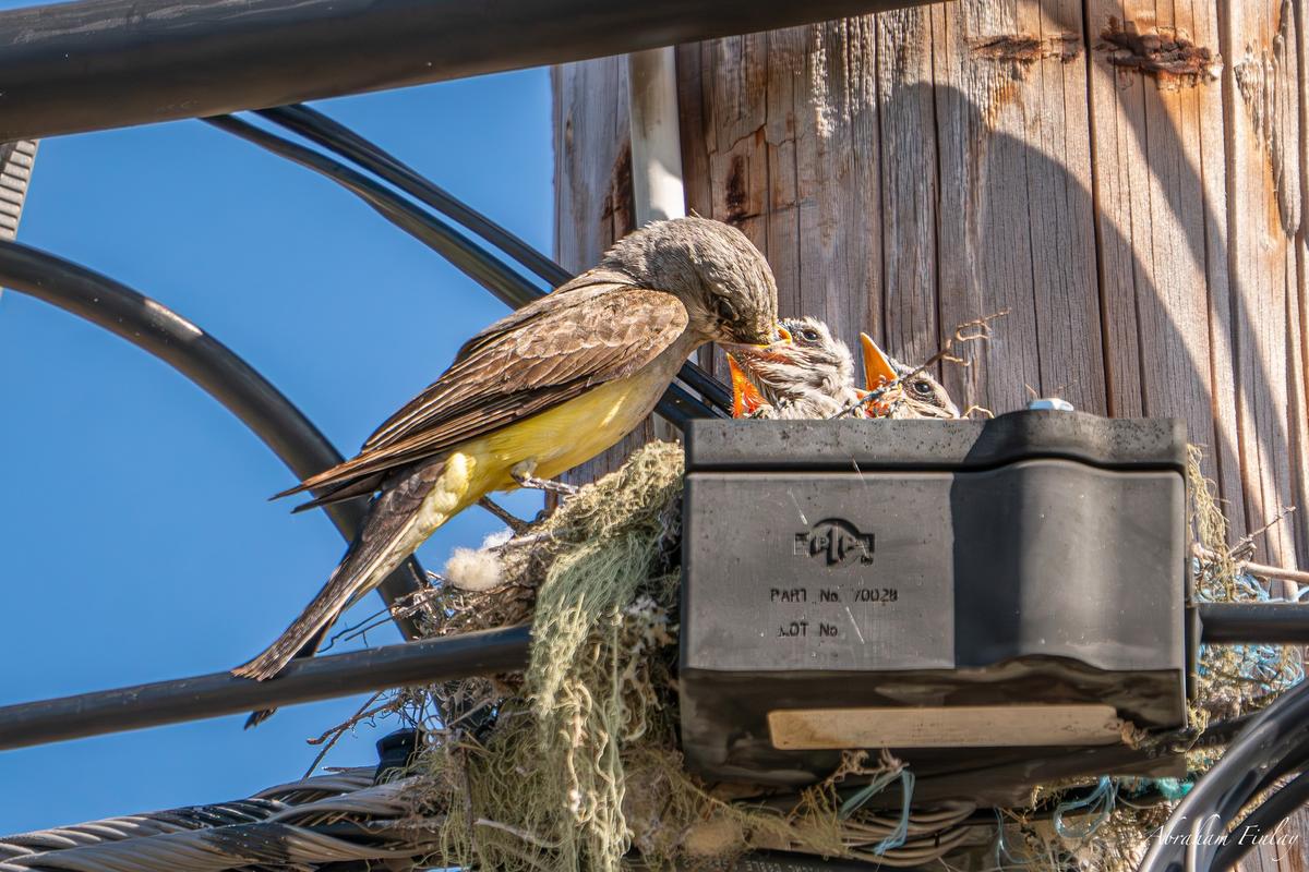 Its been fun watching this pair of Western Kingbirds raising their young over the past few weeks! The Western Kingbird is a medium-sized songbird found in the western regions of North America. These birds inhabit open grasslands, scrublands, and riparian areas, often perching on fences, poles, or tree branches to survey their surroundings. They have a distinctive appearance with a grayish-olive back, pale yellow belly, and a black tail with white outer feathers. The Western Kingbird is known for its assertive and aggressive behavior, often chasing away larger birds to defend its territory. When it comes to their diet, Western Kingbirds are primarily insectivorous. They feed on a wide variety of insects, including beetles, grasshoppers, flies, and bees, which they catch in mid-air or pluck from the ground. They are also known to consume small fruits and berries on occasion. These birds are adept aerial hunters, skillfully maneuvering through the air to snatch their prey. Their diet enables them to thrive in open habitats, where insects are abundant. For nesting, Western Kingbirds construct their nests in trees, shrubs, or man-made structures such as fence posts and utility poles. They often choose elevated locations that provide a good vantage point for spotting potential threats. The nest is cup-shaped and constructed from a variety of materials, including twigs, grass, bark, and root fibers. Both male and female birds participate in nest-building activities. Western Kingbirds are fiercely protective of their nests and will aggressively defend them against intruders, including larger birds or mammals. These birds typically lay a clutch of 3-5 eggs, which are incubated by both parents for about two weeks until they hatch.