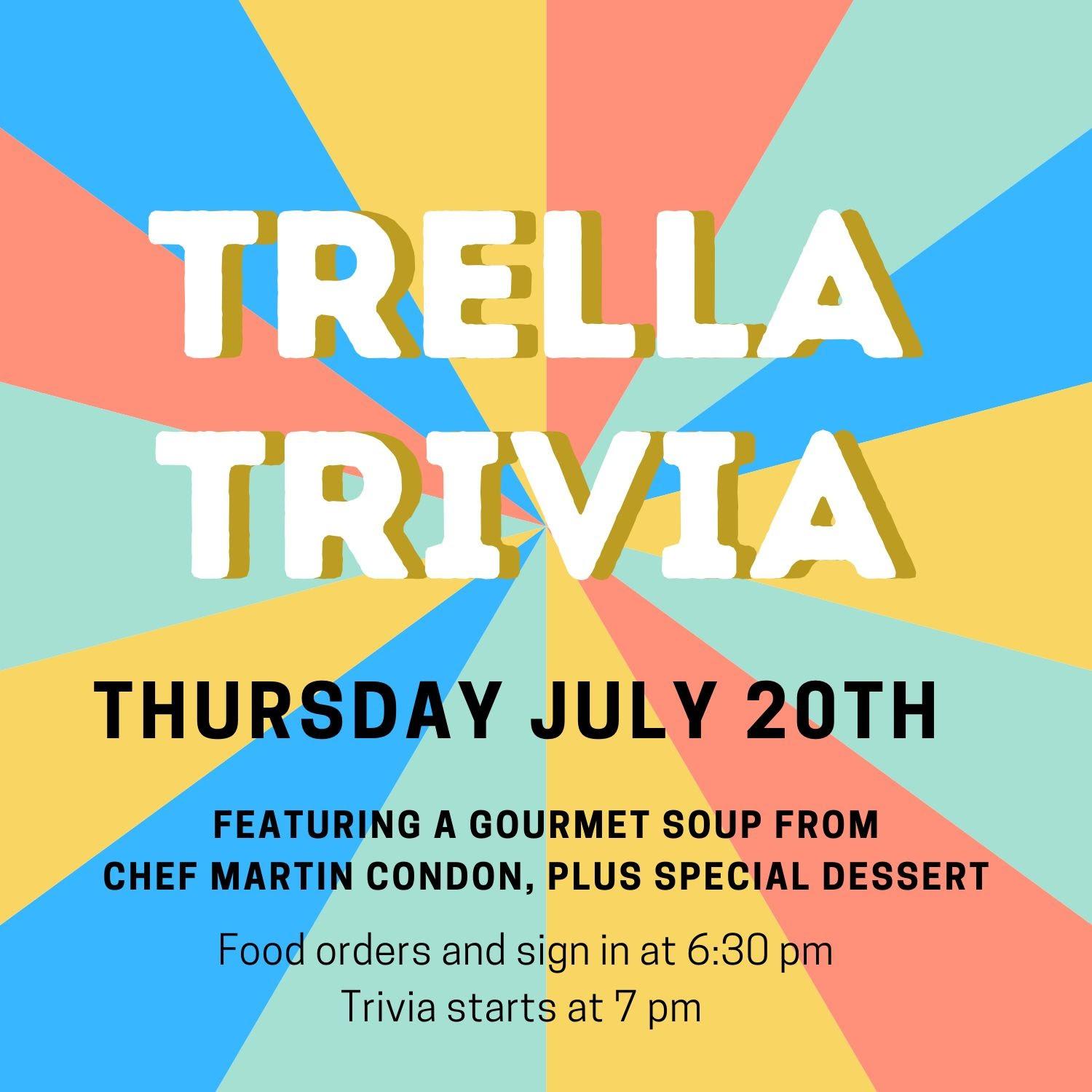 TRIVIA NIGHT AT TRELLA! Trivia Night at Trella is Thursday, July 20th! This month’s trivia is a mix of fun themes, INCLUDING: Dr. Seuss, Hit Songs, and the return of a special surprise... an Audio Category! Featuring a gourmet soup of the month from Chef Martin and cheesecake from Hippocratic Loaf. Food orders and trivia sign in at 6:30 PM. Trivia questions start at 7 PM. Come enjoy some Trella wine while showing your friends how smart you really are. It's a great night of fun, impressing your friends with your smart (or awful) answers, and of course, there's prizes... and wine! Trivia fee is $5 per person; invite your friends and compete in teams of up to 6, or join a team when you get there. You can still play if you have a bigger group, but teams of >6 can't win prizes.