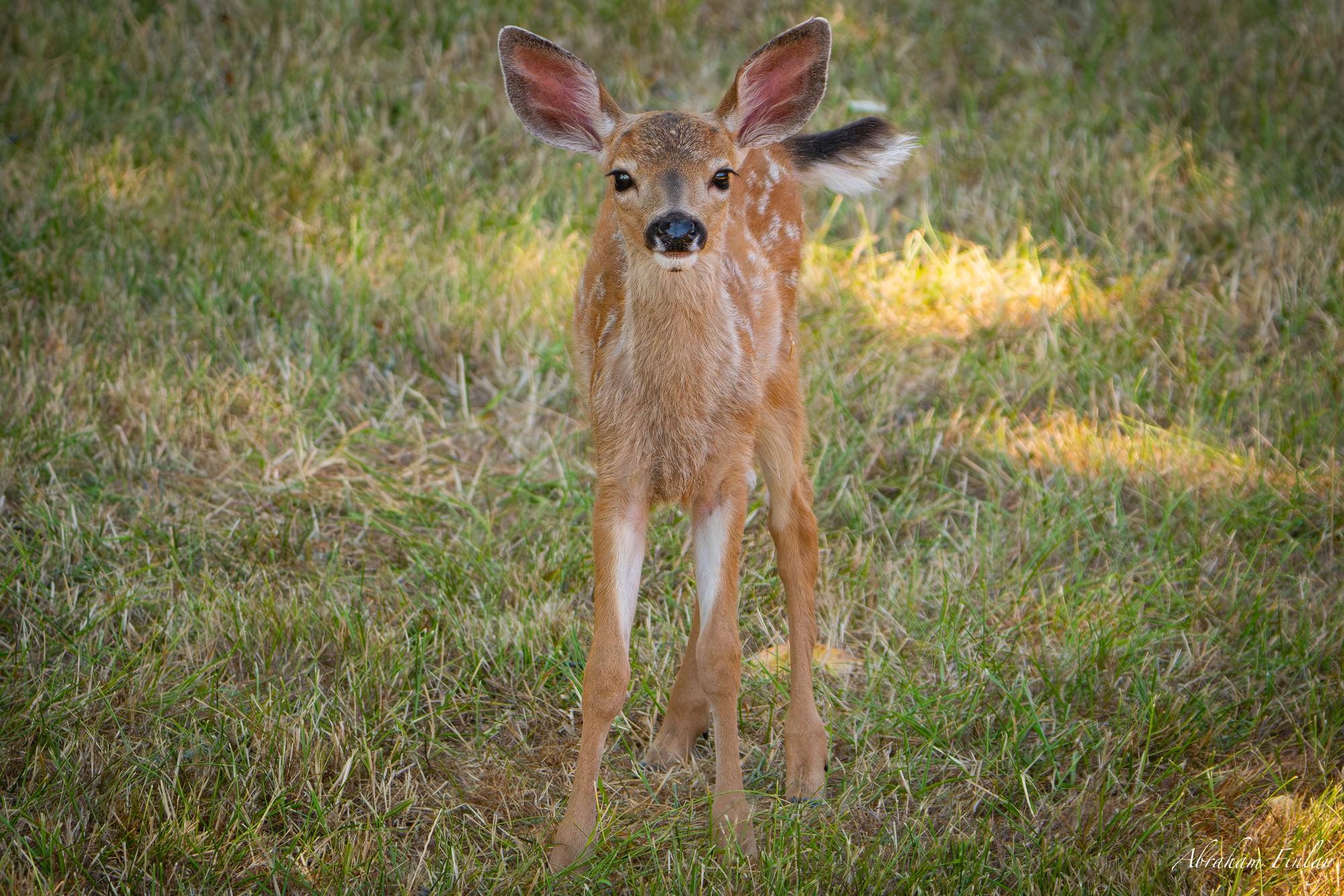 A couple of weeks ago I found this fawn along with two others resting in the shade of a large oak! Fawns have a unique spotted coat that helps them blend into their surroundings. This camouflage provides them with protection from predators in their natural habitats. As fawns grow older, their spotted coats gradually give way to a more uniform coloration. Newborn fawns have a natural instinct to stay still and hidden when approached by potential threats. They will often lie down and remain motionless to avoid being noticed. While fawns have some natural predators, including coyotes, wolves, and mountain lions, their camouflage and hiding behavior help increase their chances of survival during their vulnerable early months.