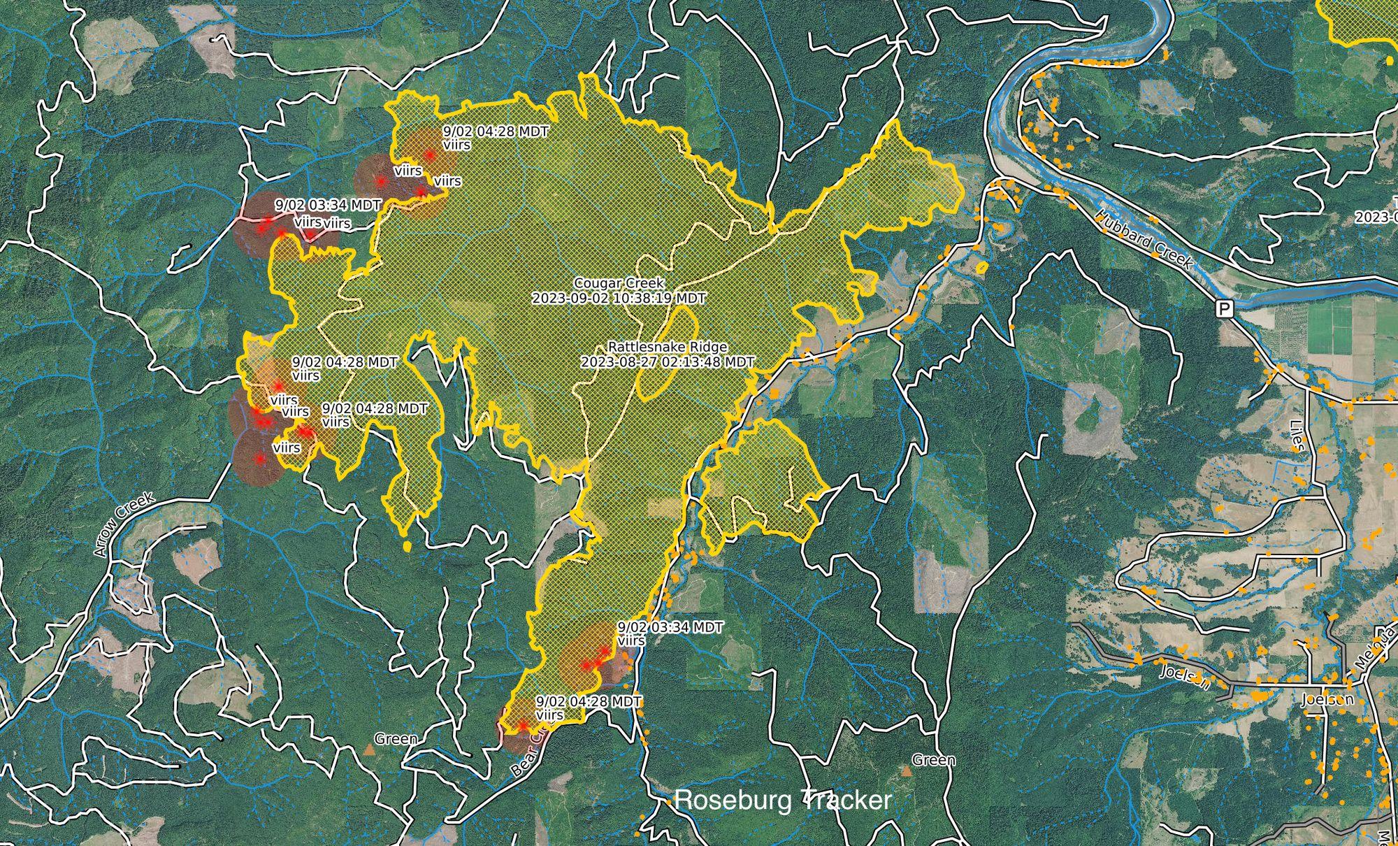 Wind has kicked up a little along with warmer temperatures and fire activity is starting to increase a bit on the Cougar Creek Fire. Hot spots were detected by satellites in the south and southwest sides of the fire. Residents of Hubbard Creek Road are seeing helicopters work in the areas of the hot spots.