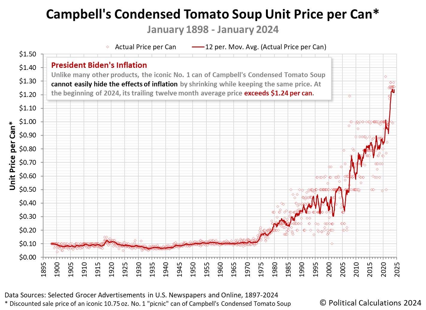Someone documented the price of the same size can of Campbell’s tomato soup over the last hundred years. Since 2020, the price has gone from $.84 to $1.24. That’s a 47.6% increase in price due to inflation just in the past four years. So as our politicians squabble about how much money they are going to spend, just remember we have a $2 trillion budget deficit each year. The money they are spending is going to mean more money printing and more inflation. Everyone is going to pay for it. Want lower inflation numbers? Demand less spending from your politicians. Also, note that the US disconnected our currency from any sort of restraint or gold standard in 1971 and look what has happened since.
