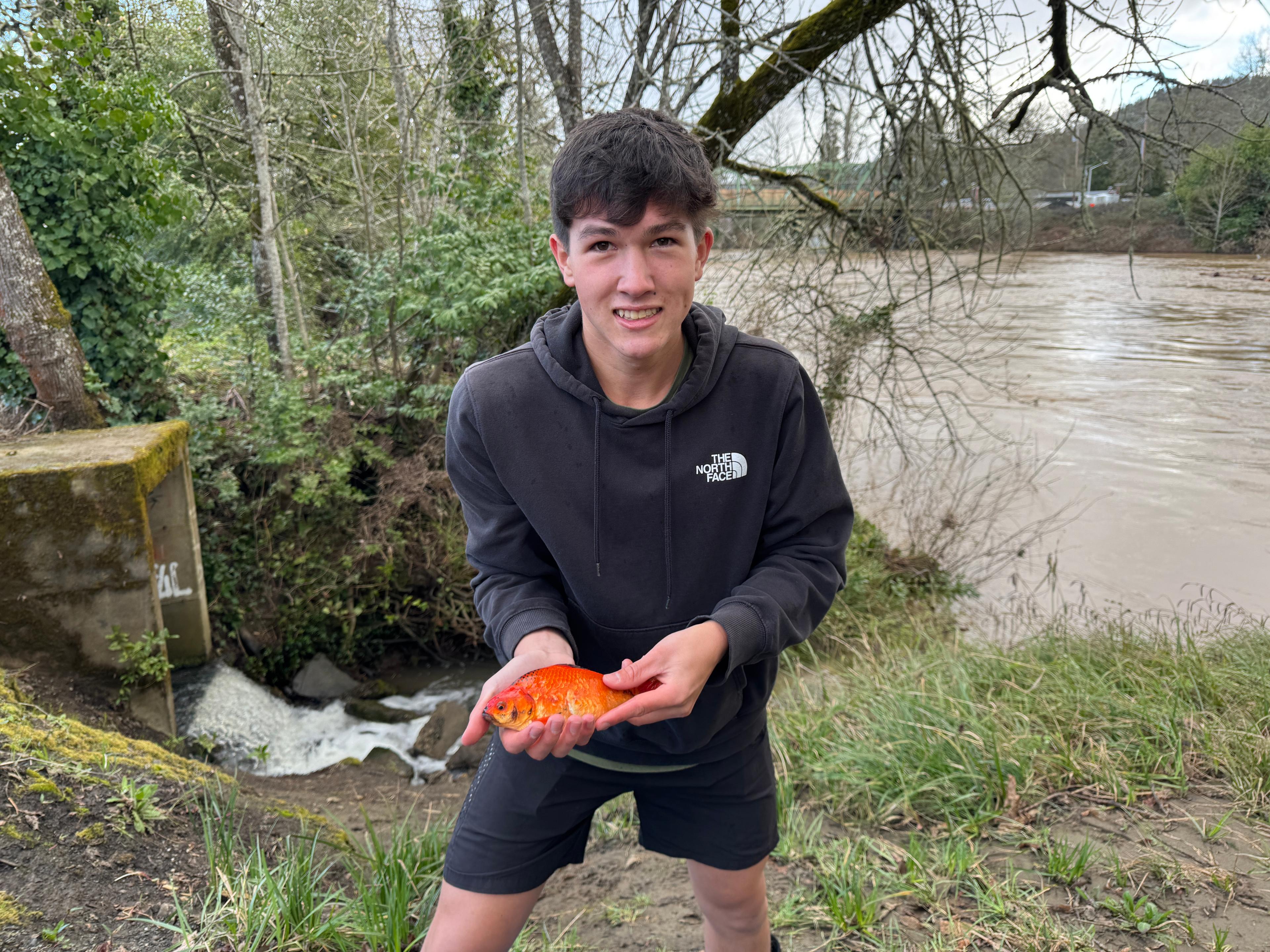Abraham and I were walking along the South Umpqua River just now in Stewart Park and I spotted a goldfish at the edge of the river. So Elijah brought us a net over and we caught it! Did anyone lose a pretty good size goldfish along the South Umpqua river or from Deer Creek the last few days?