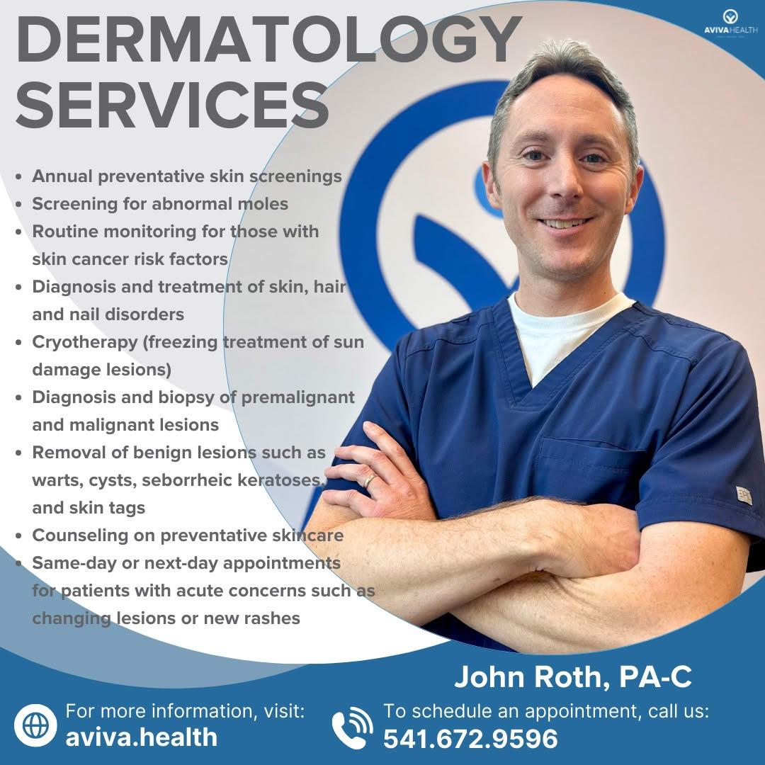 Aviva Health now provides dermatology skin care services for all ages from little ones to senior citizens. Their new provider, John Roth, PA-C, offers expert care from screenings to specialized treatments. Having grown up in Roseburg, he's excited to serve the community! 💙 Dermatology Services at Aviva Health Provider: John Roth, PA-C Services: - Annual preventative skin screenings - Screening for abnormal moles - Routine monitoring for those with skin cancer risk factors - Diagnosis and treatment of skin, hair and nail disorders - Cryotherapy (freezing treatment of sun damage lesions) - Diagnosis and biopsy of premalignant and malignant lesions - Removal of benign lesions such as warts, cysts, seborrheic keratoses, and skin tags - Counseling on preventative skincare - Same-day or next-day appointments for patients with acute concerns such as changing lesions or new rashes Contact Information: - Website: aviva.health - Phone: 541.672.9596