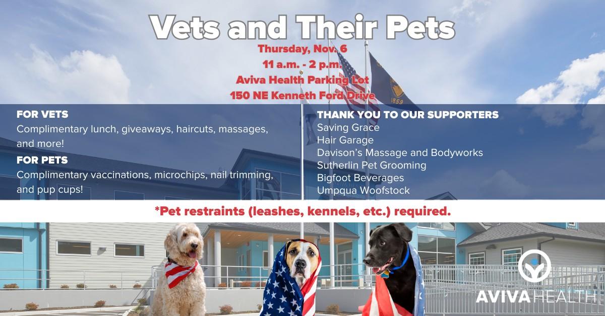 Aviva Health will host a free event for Douglas County veterans, their families, and their pets on Thursday, November 6, from 11am to 2pm at the Aviva Health parking lot. 150 NE Kenneth Ford Drive in Roseburg! The event will include lunch, giveaways, haircuts, massages, and pet services such as microchips and nail trimming. The event is free for veterans, their families, and their pets, supported by several local businesses and organizations. Date: Thursday, November 6 Time: 11 a.m. to 2 p.m. Place: Aviva Health Parking Lot, 150 NE Kenneth Ford Drive, Roseburg