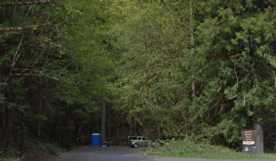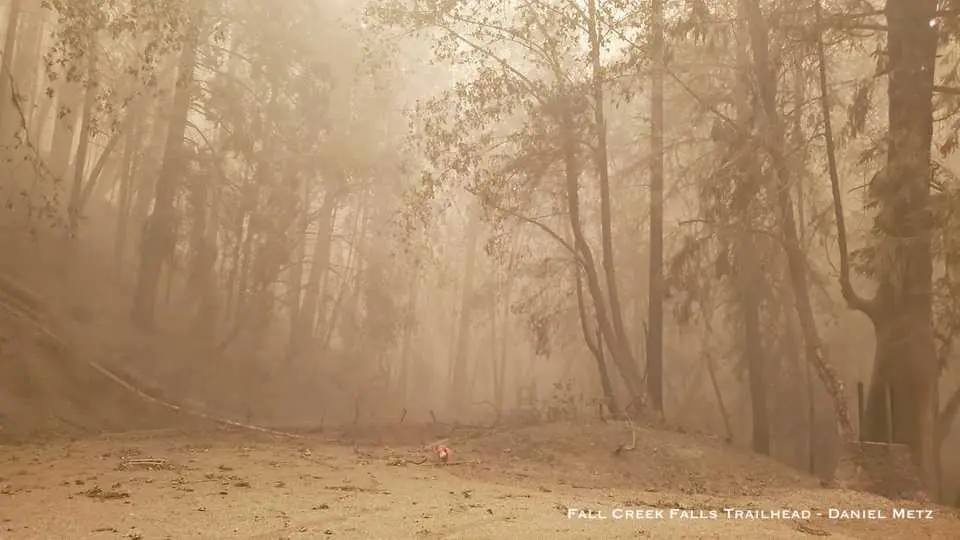 This is a before and after photo of the Trailhead at Fall Creek Falls on Highway 138. It was burned in the Archie Creek Fire.
