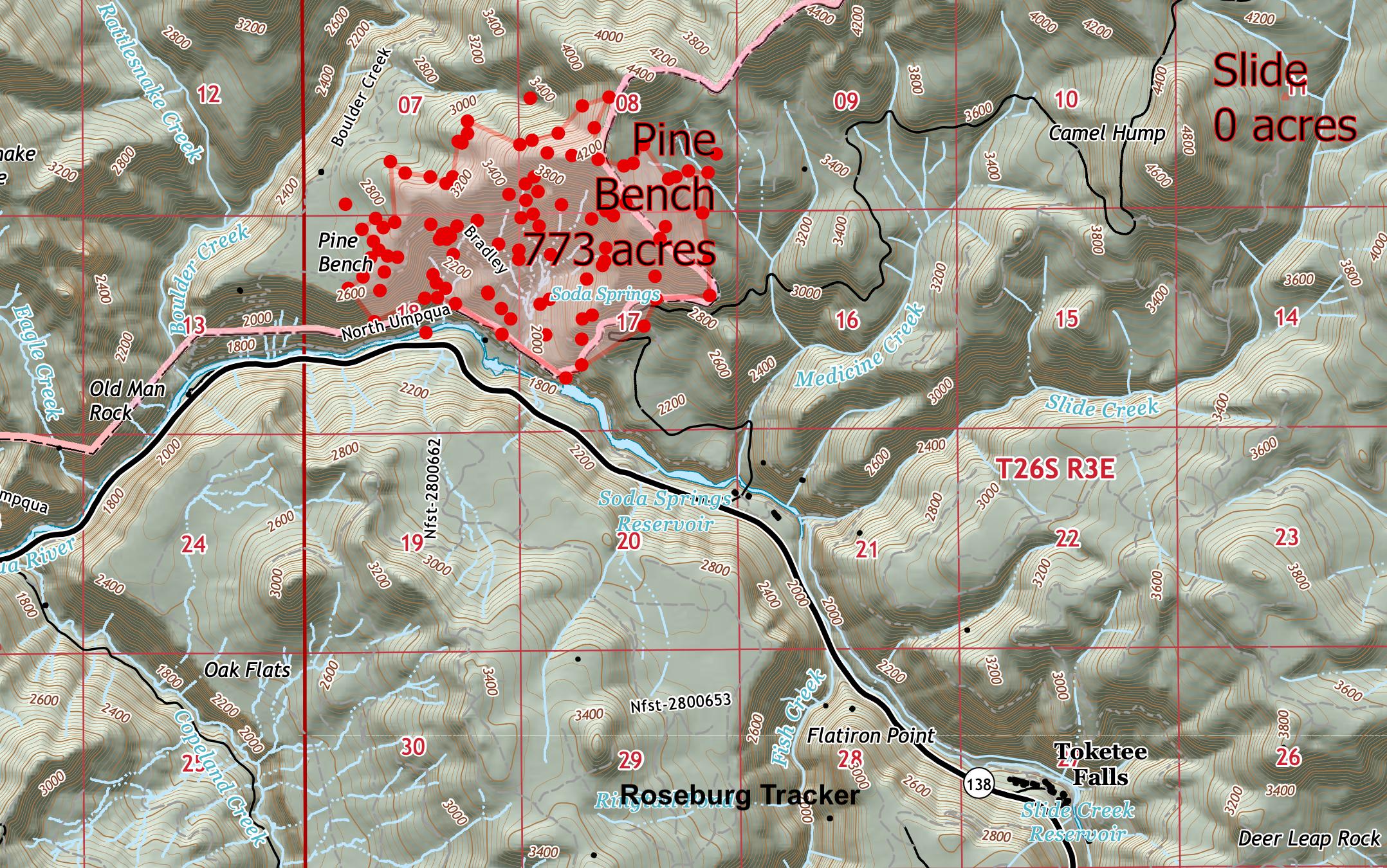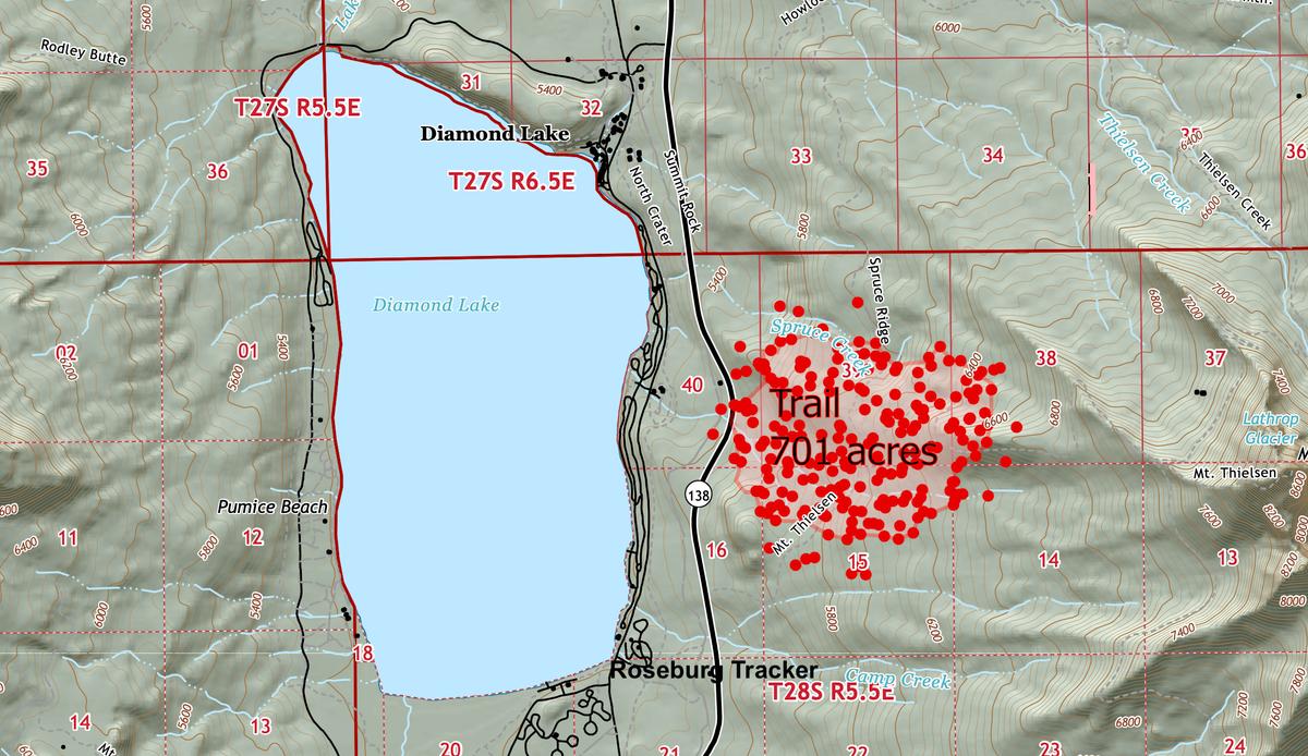 The Boulder Flat/Pine Bench Fire smoldered for close to 16 hours at around 2 acres in size. Then Thursday afternoon it exploded and grew from a few acres to 773 acres as of Friday morning. The Trail Fire next to Diamond Lake has been mapped at 701 acres as of Friday morning, so smaller than previously estimated. Tankers have been working on that fire extensively to keep it as small as possible. The Lemolo Fire grew from 15 acres to 179 acres as of Friday morning. The Watson Fire is at 37 acres. The Pig Iron Fire is at 2 acres. More information to come as it becomes available.