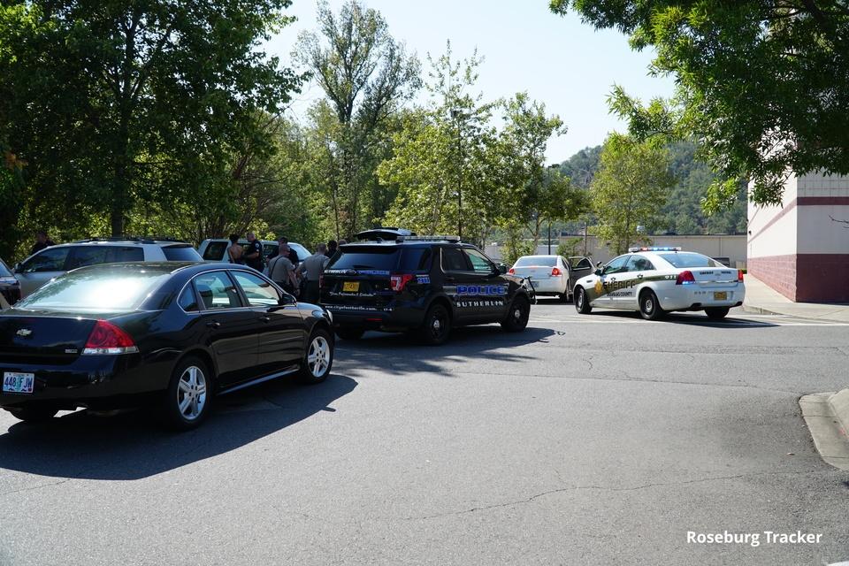 Shortly before 2pm this afternoon, an Oakland resident (I'll refer to her as Jane) had just returned from grocery shopping. After bringing several loads inside her house, Jane noticed a car parked in the street with its hazard lights on. Jane decided that after bringing in the next load, she would go look into what was going on. Right at that moment, Jane noticed two guys running out of her neighbors home with a bunch of the neighbors belongings, including several firearms. At this point, Jane threw her groceries on the ground and started yelling at the suspects while simultaneously dialing 911. She also yelled out to another neighbor to follow the suspects and report their license plate number. Jane also was able to quickly get ahold of the person who's home was robbed and let them know what had happened. Fortunately they were not home at the time. Sutherlin Police responded very quickly. The three suspects involved in the robbery then led police on a chase down I-5, to Del Rio Road, to Garden Valley, to Stewart Parkway before finally ending in the back corner of the Albertsons parking lot. All three suspects fled on foot and were apprehended shortly thereafter. Apparently the suspects had several guns in their possession, some of which they may have discarded out the window during the police chase. A rifle case with gun reportedly still in it can be seen partially under the back rear tire of the suspects vehicle at Albertsons. Collection of other discarded items was also taking place this afternoon. Law enforcement officers from Sutherlin Police Department, Roseburg Police Department, Douglas County Sheriffs Office as well as Oregon State Police worked together to apprehend the suspects. Excellent job by our local law enforcement officers! More details to come...