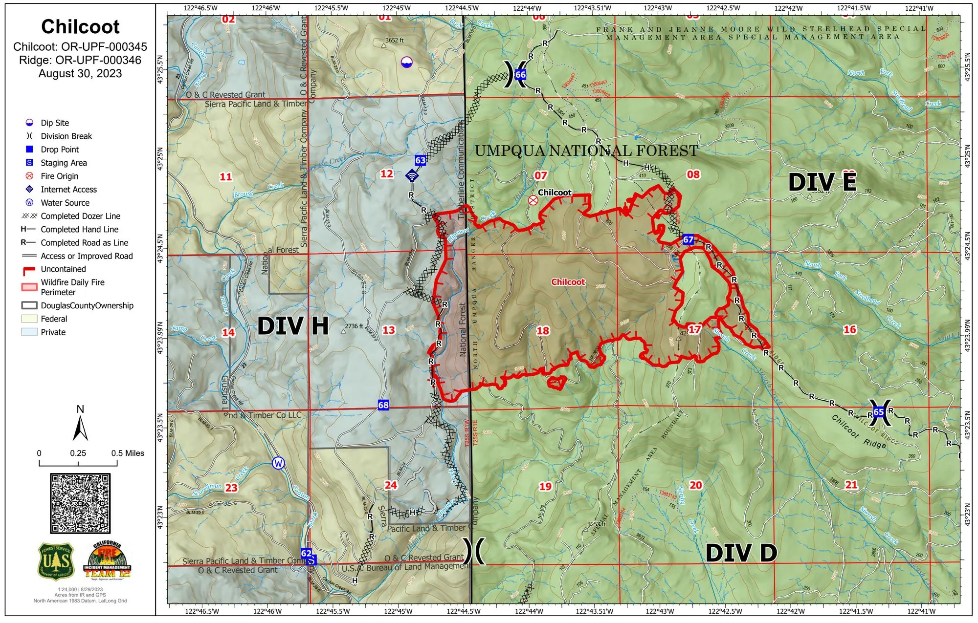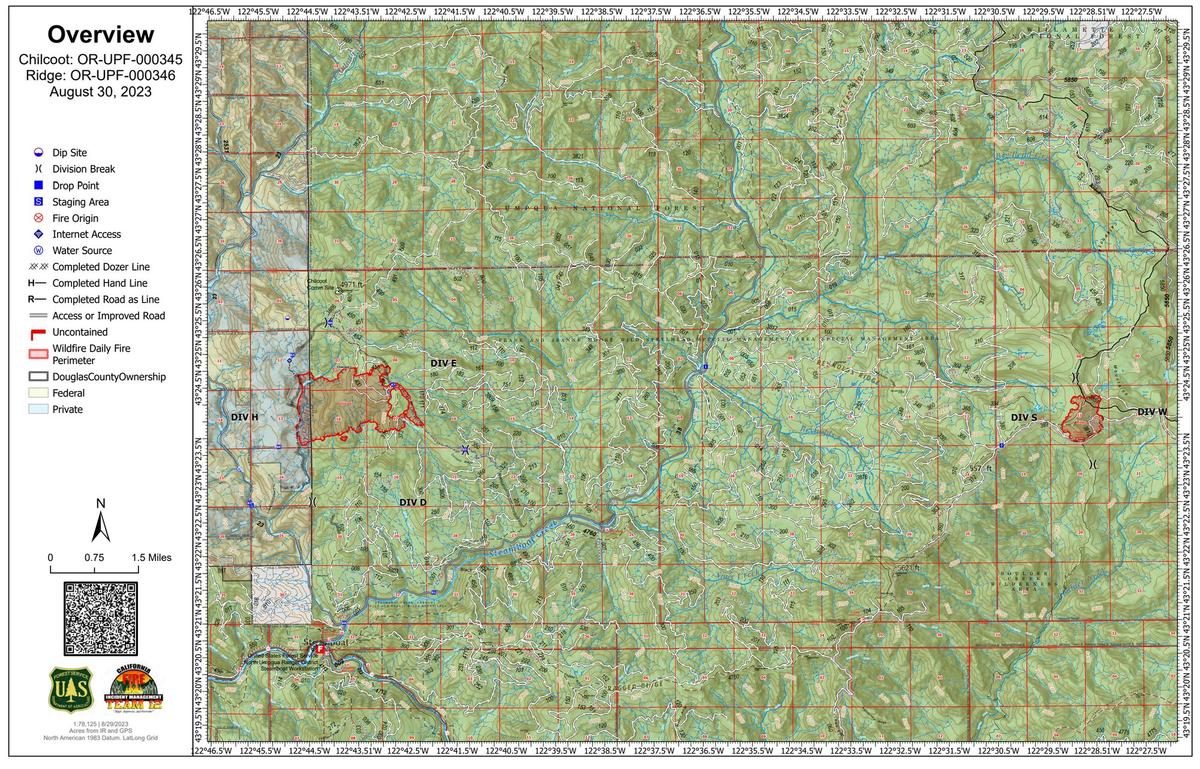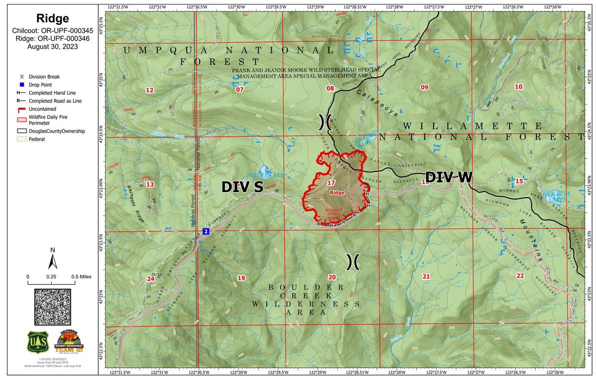 The Chilcoot Fire is currently at 1,390 acres and 0% containment in the U.S. Forest Service - Umpqua National Forest. Handline construction along the 3806 Road was completed along with strengthening of the already established lines around the spot fires on the northeast side. Firefighters, working closely with local forest Resource Advisors (READ), have secured line around the Chilcoot Repeater site as well as other cultural and natural resources. Yesterday’s cooler temperatures and elevated relative humidities aided firefighters. The inversion layer lifted earlier, allowing aircraft to support the Chilcoot for a good portion of the day. Additional equipment and personnel have arrived at the incident, with more on order. These additional crews will be divided into day and night shifts, increasing the 24-hour suppression activities. Community Meeting Wednesday Night at 7 pm, join the California Interagency Incident Management Team 12 (CAIIMT12) for a community meeting on the Chilcoot and Ridge Fires. Fire staff will discuss fire activity and suppression operations in-person at the Glide Revitalization Center at 125 Wild Thyme Lane, Glide, Oregon, 97443. The meeting will also be streamed online at https://www.facebook.com/profile.php?id=61550481586772