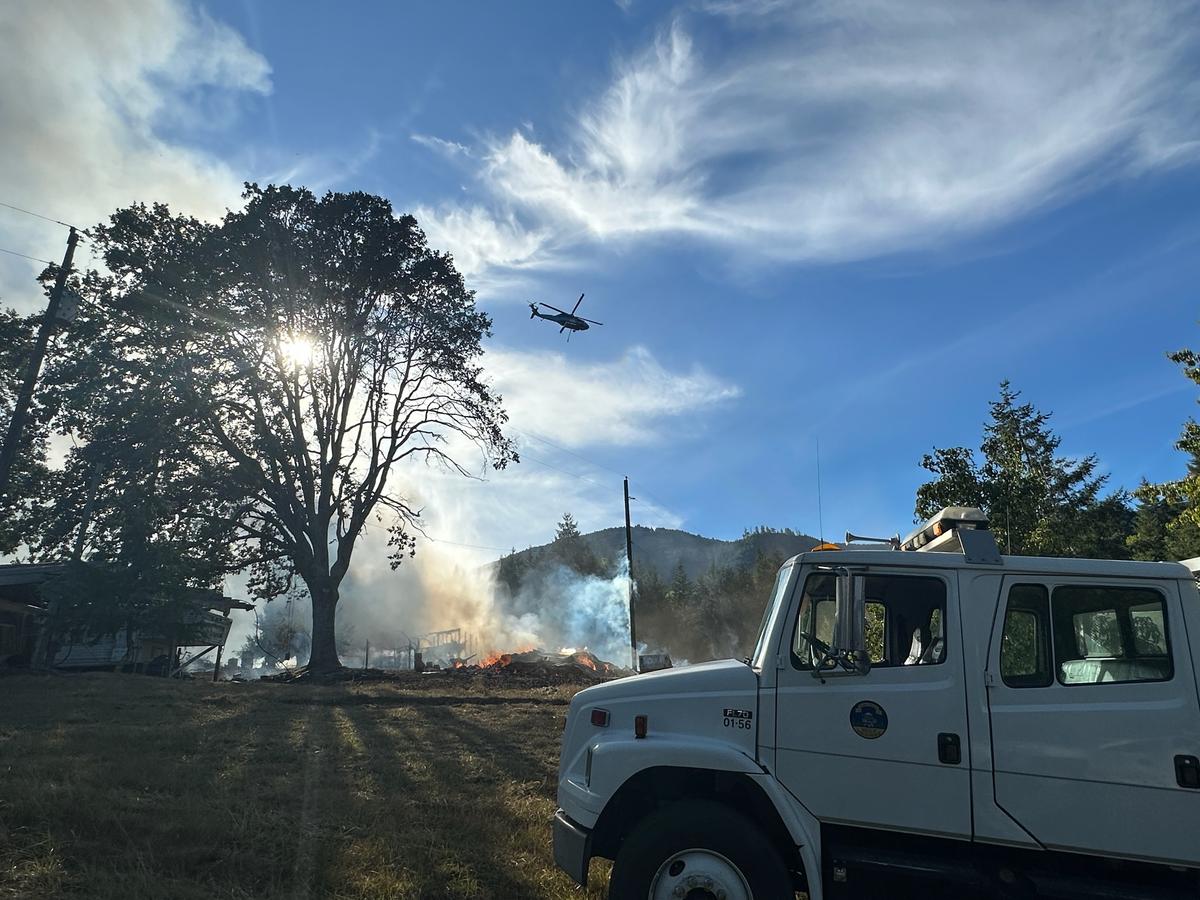 At approximately 3:32 p.m. on Sunday, September 10, 2023, crews from Douglas Forest Protective Association (DFPA), Sutherlin Fire Department, Oakland Rural Fire District, Fair Oaks Fire District, Douglas County Fire District No. 2, Kellogg Rural Fire District, North Douglas Fire & EMS, and the Douglas County Sheriff’s Office responded to reported structure and vegetation fire near the 4900 block of Cole Road in Oakland, OR. Crews arrived at the scene to find heavy fire conditions from the affected structures and vegetation with a large black column of smoke visible to all surrounding areas. An aerial attack, with two helicopters, was essential to holding this fire in check while ground crews, including a DFPA dozer, quickly made progress in establishing a control line. With the mutual aid partner response, which also included additional resources of a 20-person hand crew, Task Force Leader, and a helicopter from the nearby ODF Incident Management Team 3, the forward spread of this fire was successfully contained at 3.85 acres with no reported injuries of firefighters or civilians. 3 outbuildings including one shop, one barn, and one pump house were lost. Two RVs and four vehicles were also lost; however, the main residence was successfully saved by the first arriving Sutherlin Fire and DFPA responders. The fire area was cleared by all responding agencies by 10:47 p.m. and all evacuation levels for the 4700 – 4900 block of Cole Road has been lifted by the Douglas County Sheriff's Office. The cause of this fire is currently under active investigation and is not in correlation to the Tyee Ridge Complex. Fire Season is still active in the district and public and industrial use regulations are in place. Please continue to follow these restrictions for everyone’s safety. For more information on the fire restrictions that are current in the Douglas District, please visit www.dfpa.net. Via DFPA